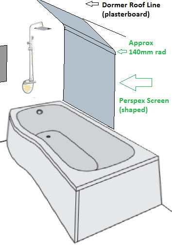 Side of P Shape Bath/Shower needs some sort of perspex type screen that fits the roof line of Dormer wall side. Previously was just cheap waterproof panel attached to plasterboard. Was thinking along lines of attached image. The screen attached to bath is ok so will keep. Maybe you can buy such screens or someone makes etc?