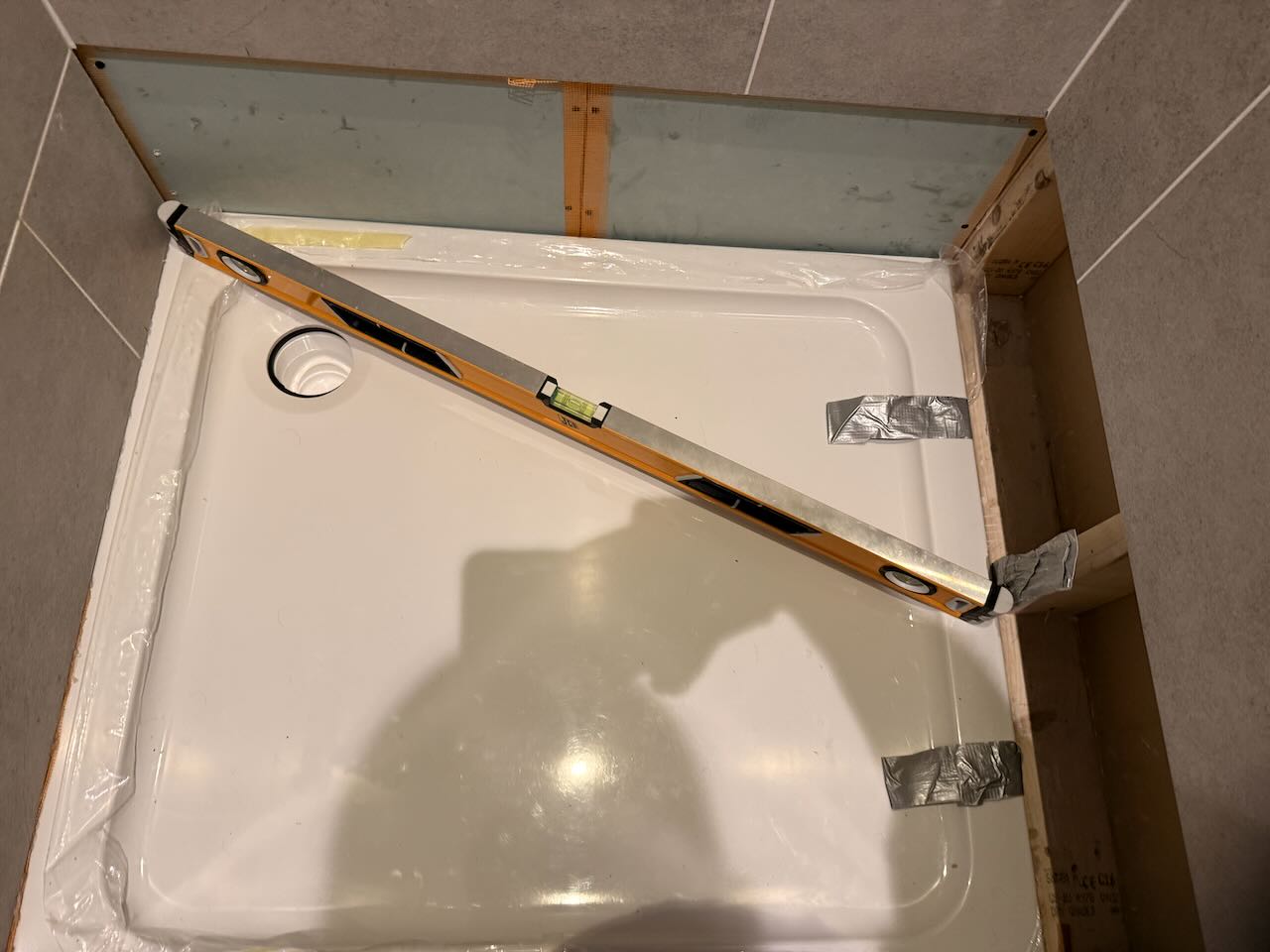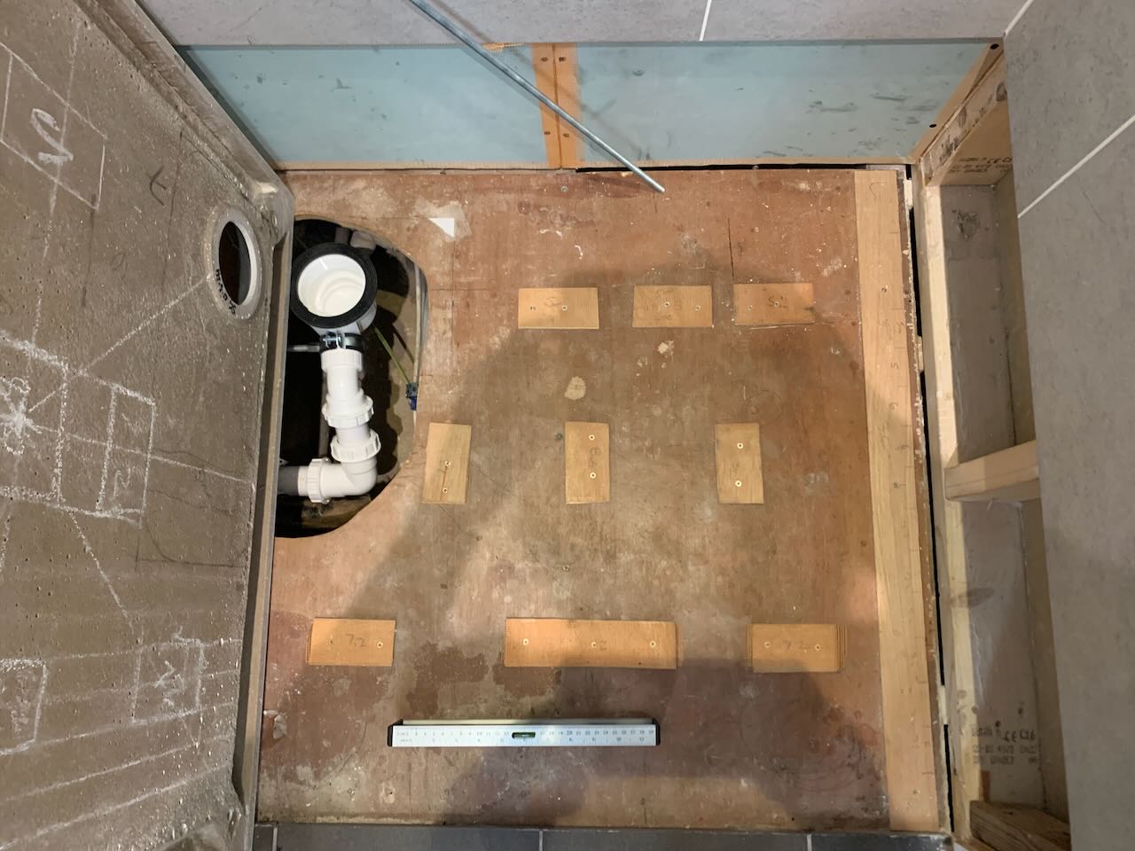 First, I'm going to raise the floor using exterior hardwood plywood as the new tray is 45m high but the current gap to the tiles on the shower side is 60mm - so the final gap will be 2mm for silicone. Could have brought a 50mm tray but higher prices + felt matching old might be best move. The old tray was 45-47mm high. Correction* : the floor is not level. Its 9mm lower on the shower side so ill need to put down a sloping piece of plywood = 10mm right to 1mm left.