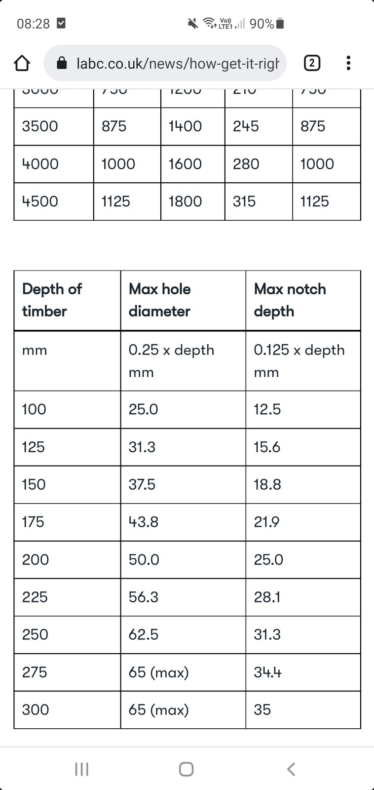 It's a 44mm hole through the centre of a 9" joist, building regs state max hole in a 9" joist is 56mm so It should be ok ?