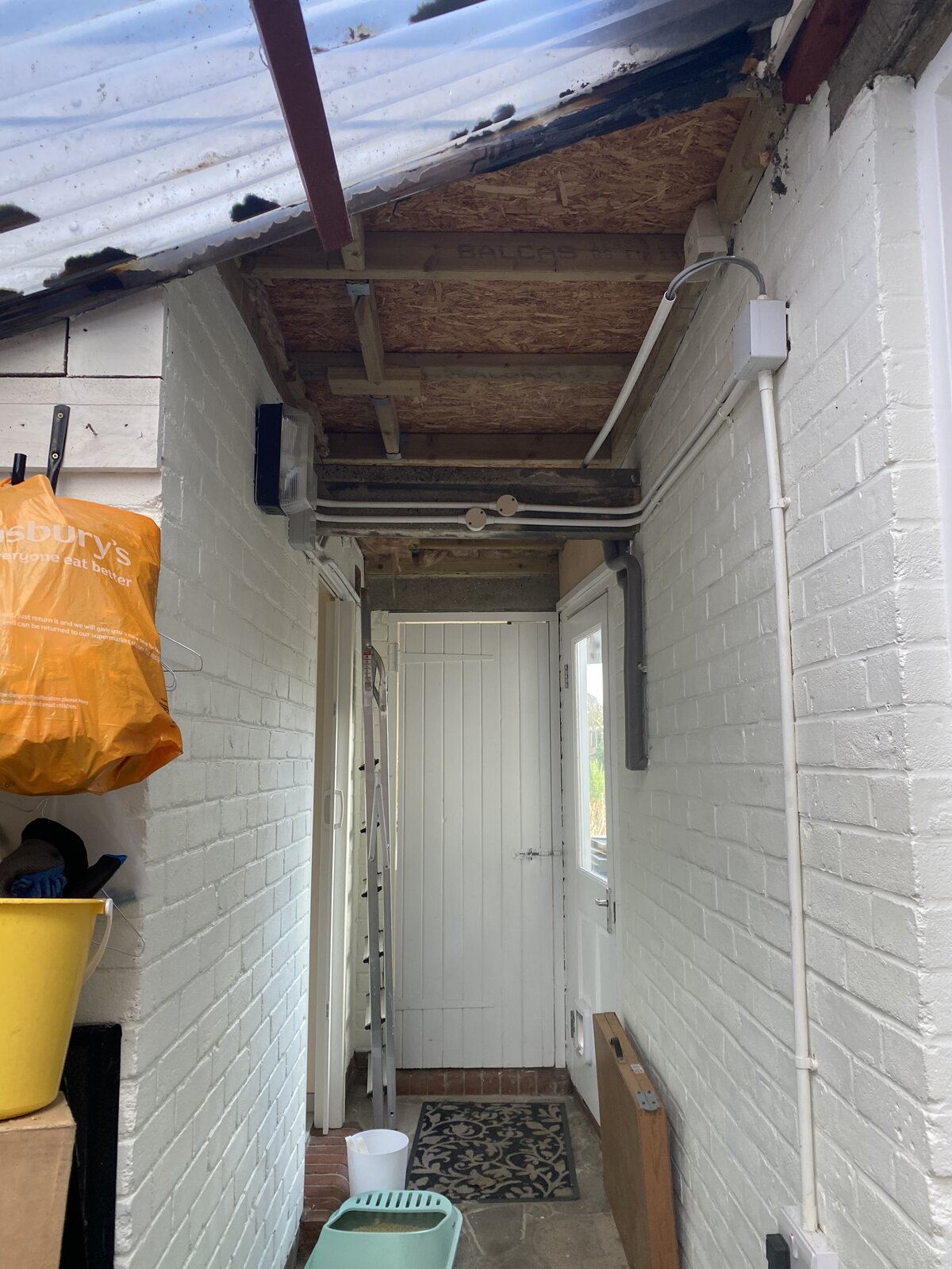The side space is currently a mish mash of 3 sections, - at one end, protruding into the garden is a utility room. It's a properly constructed brick room with flooring, ceiling, electrics, plumbing.. though no heating. It has a wooden gate type door with a bolt. In the middle section between the back kitchen door is a section which has 'outdoor' crazy paving flooring, but then a partially contructed (unfinished) ceiling. The cooker hood currently vents into this. There is also a tiny WC in this part (with proper insulated ceiling and brick walls.) At the front, openly adjoined to the middle section is a lean-to with a wooden frame (rather rickety as possibly with wood worm), built onto the boundary, with PVC sloping panels, and wooden front gate.