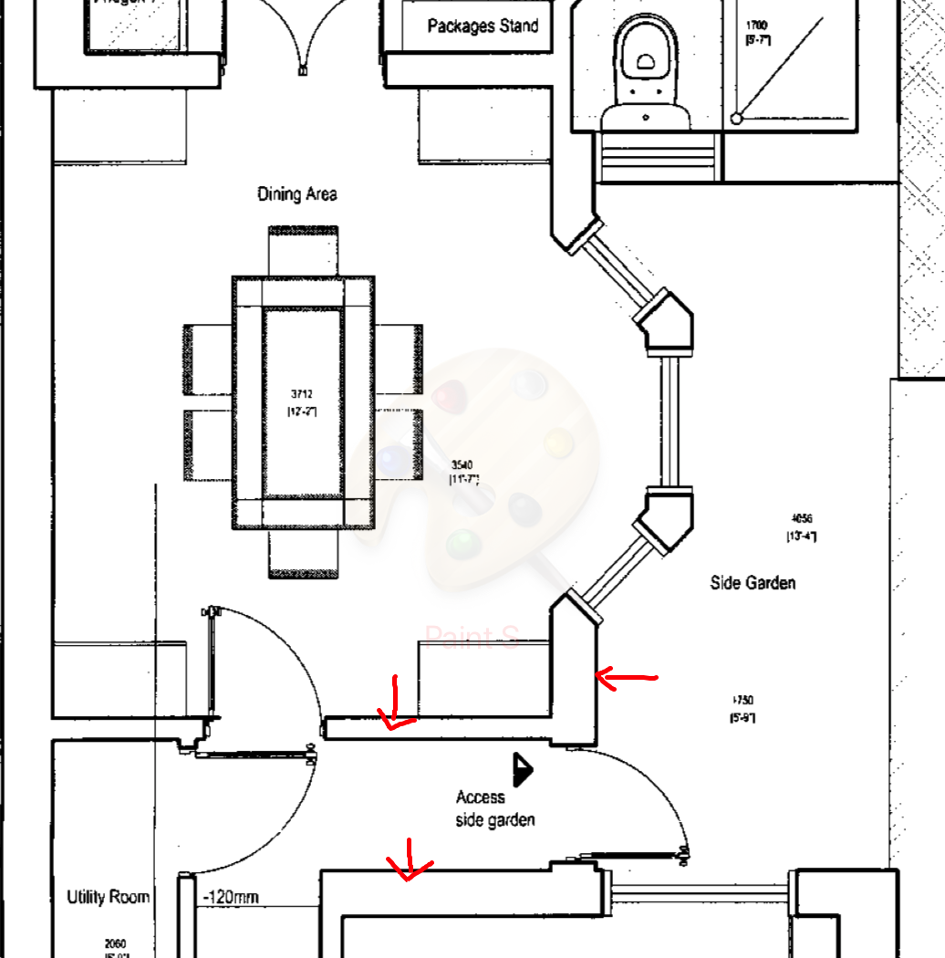 3) Where I have drawn a blue arrow currently sits a window from a recent extension, behind the window is a shower room - if I take out the shower room how can I get air and light into the room, whilst still maintaining privacy.