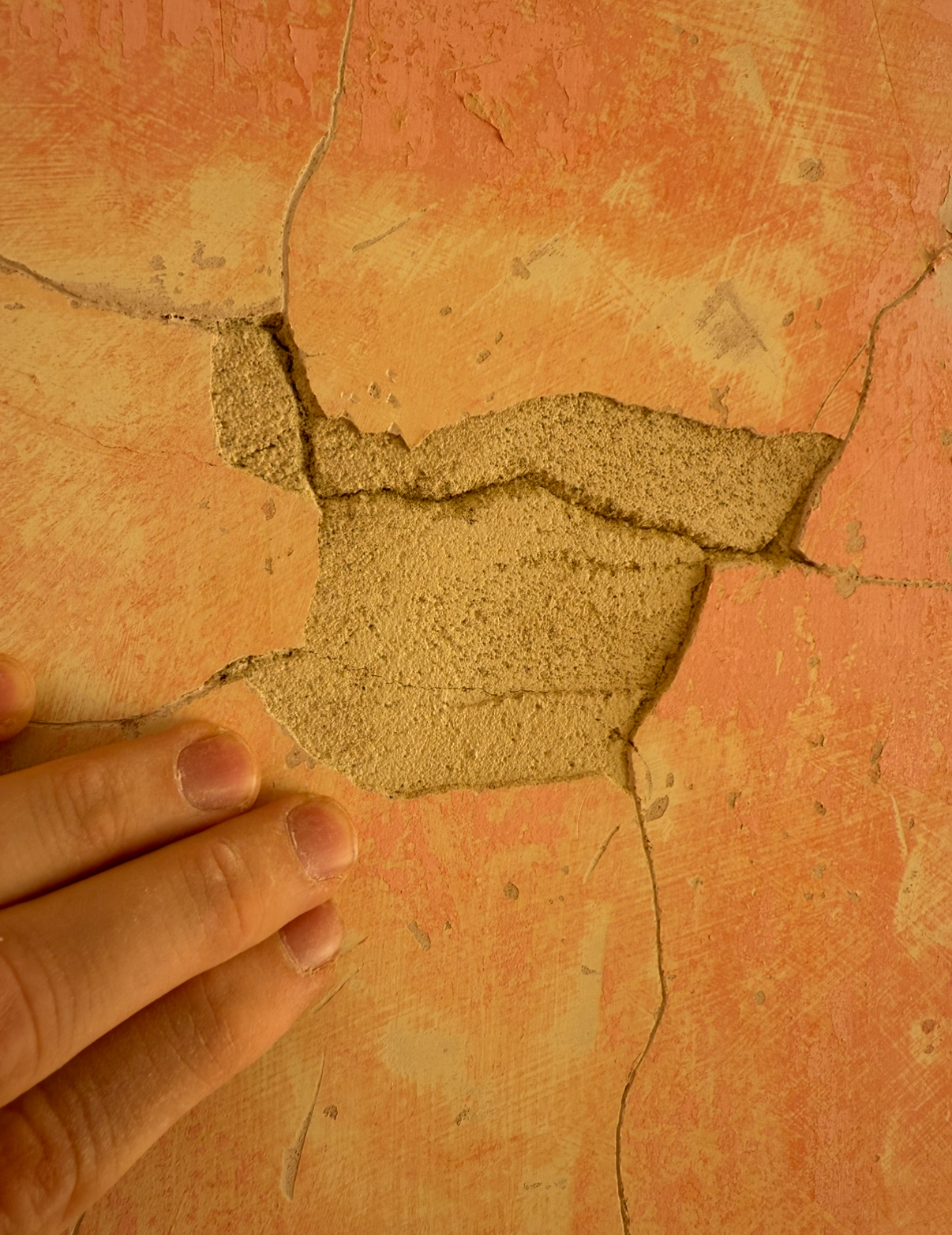 There’s a 2mm layer of plaster on top of what I think is layered plaster, which sits on top of the breeze blocks. So I believe the thin layer is an old skim coat. Some of this has blown and come off to leave exposed areas up to 6 inches across.