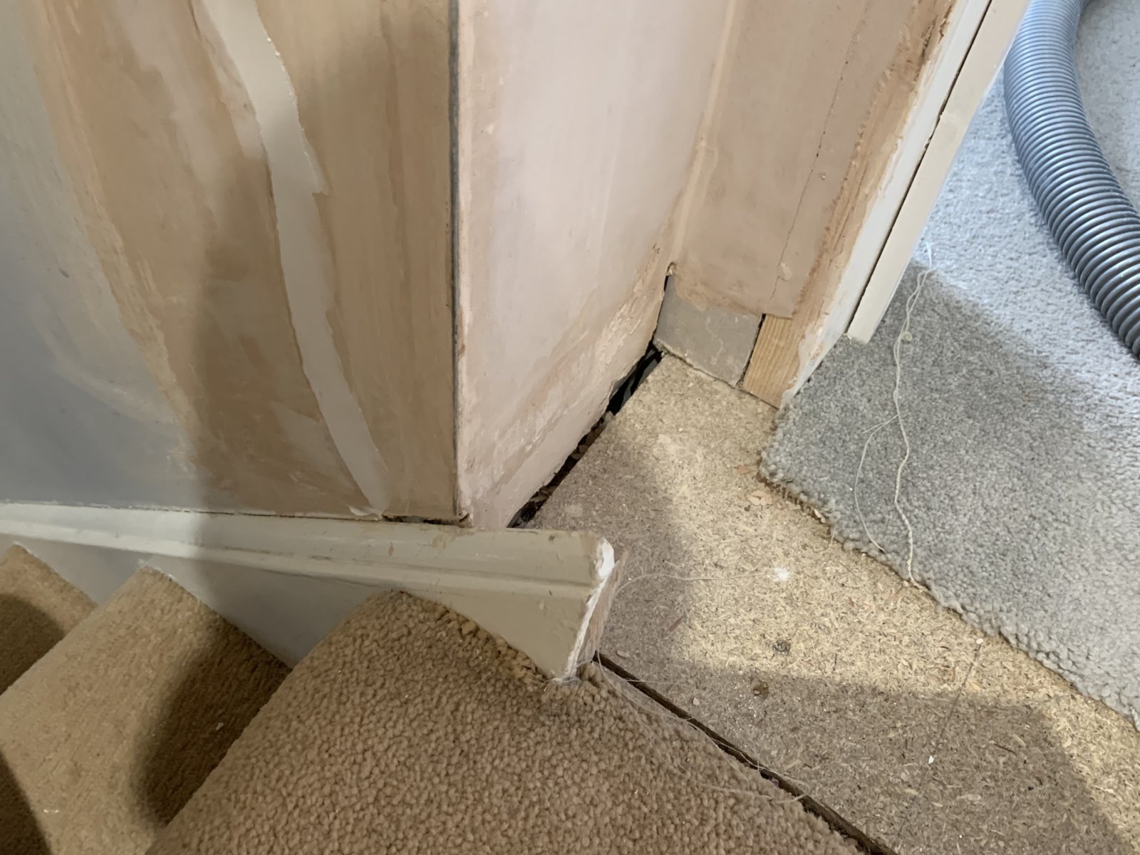 I don’t know if I should trim the existing timber which runs down the stairs back flush with the wall and then fit the skirting or fit the skirting and then cut the overhang off.