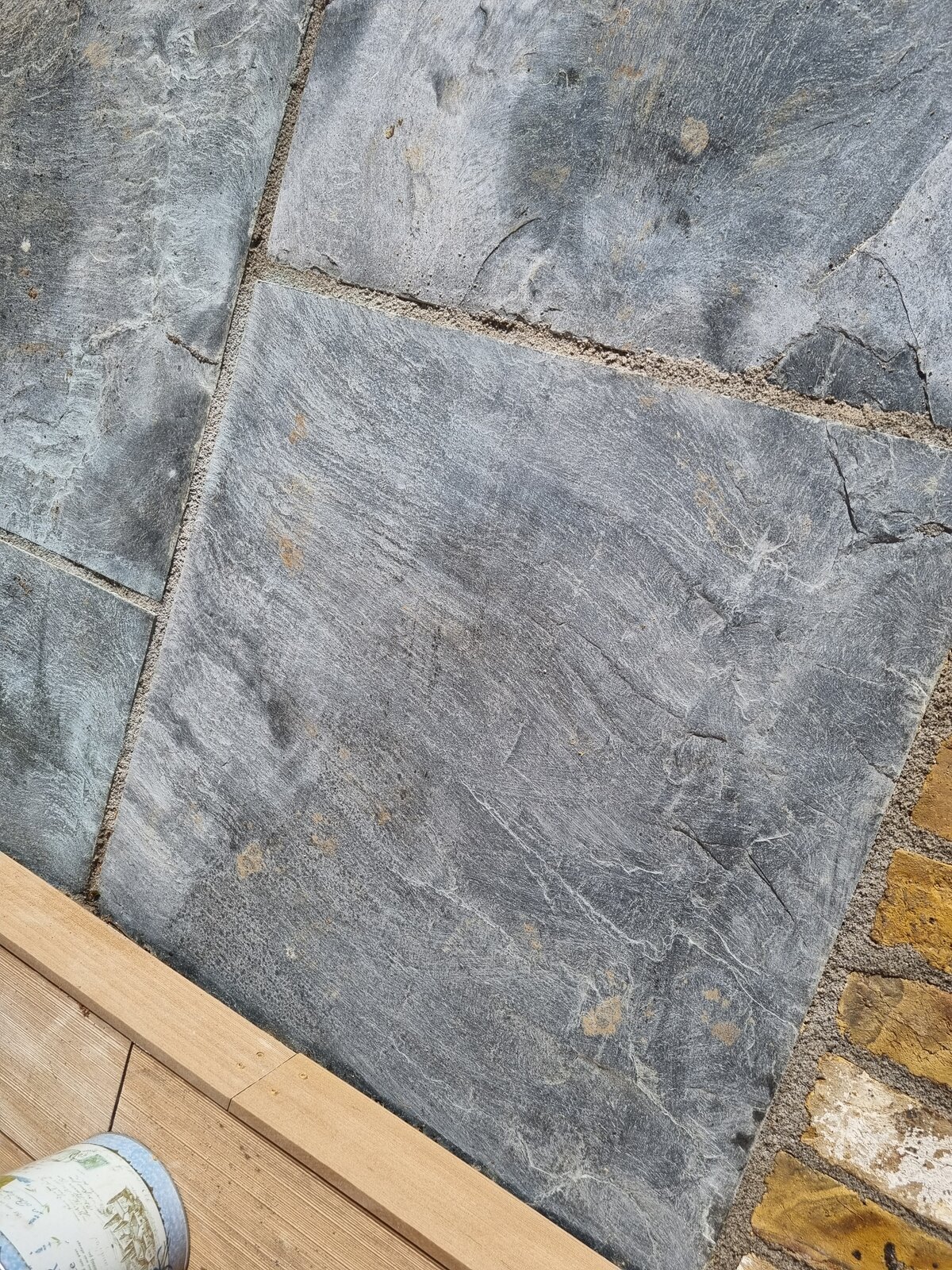 we recently laid a slate patio. After the builders applied the jointing compound (Gftk Vdw 850-plus), the slabs developed a horrible white hue. When they are wet you don't notice it, as soon as they dry, it's horrible. Nothing compared to what they were dry before the grout was applied. It kind of looks like efflorescence but it's not removed with brushing. I am not sure if the grout is responsible for this, it would be a coincidence if not, but I don't know.