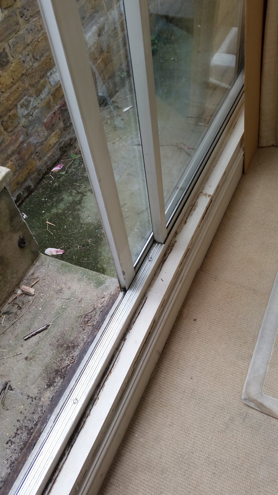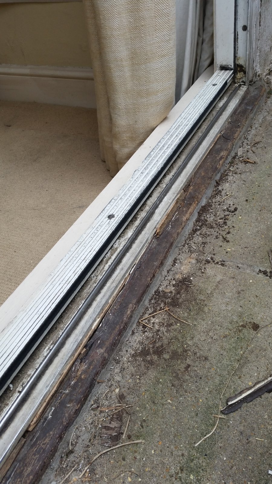 This door no longer runs well. It squeaks and jams. The wheels under the sliding panel/door are ok but the problem is the wood underneath the alu base is rotted. The track is no longer flat in either plane. Anyone taken on a job like this?