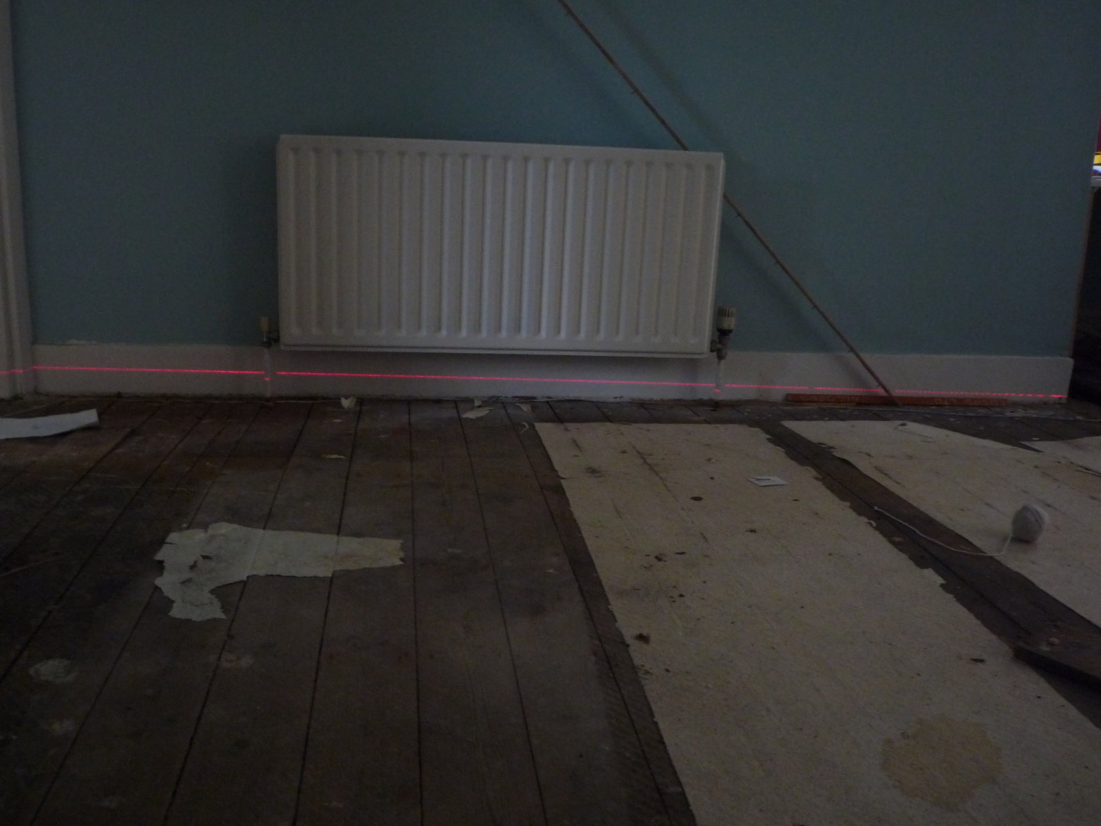 Laser_Level.jpg - showing the laser level with a 5cm drop by the door and levelling out further towards the right wall.