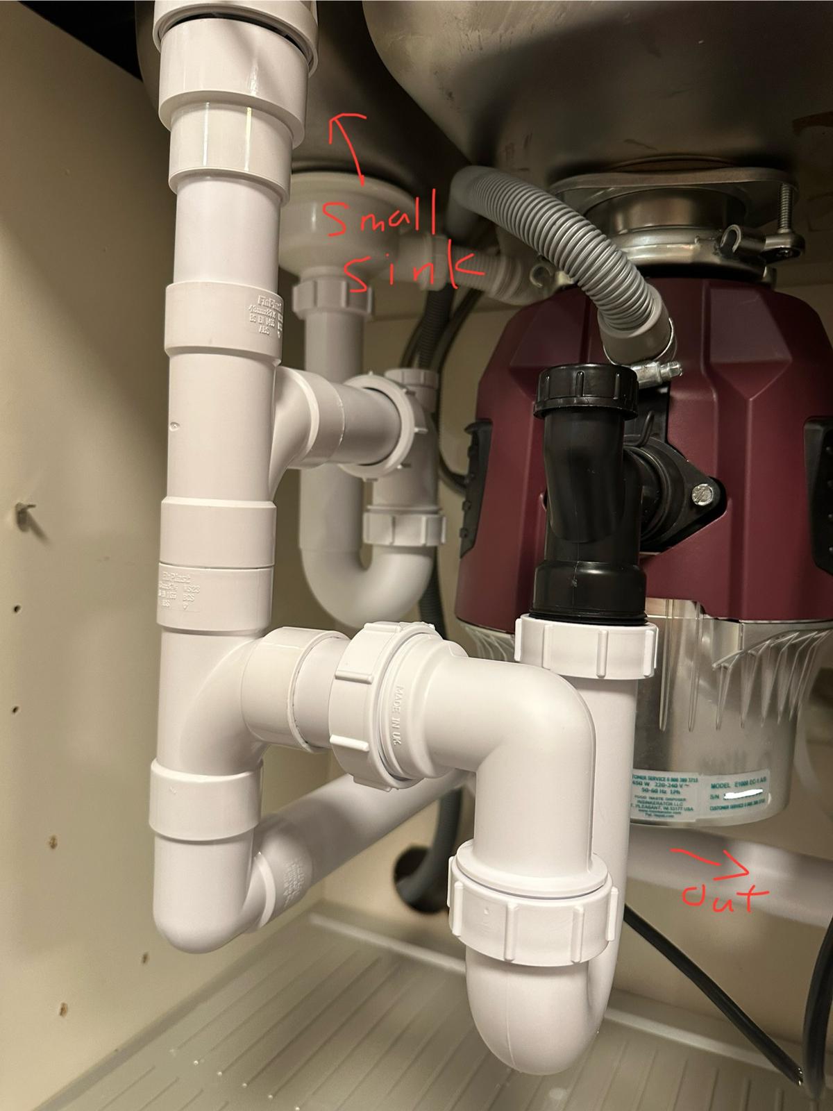 1. Photo 1 – overall view of disposer + small sink waste connection.