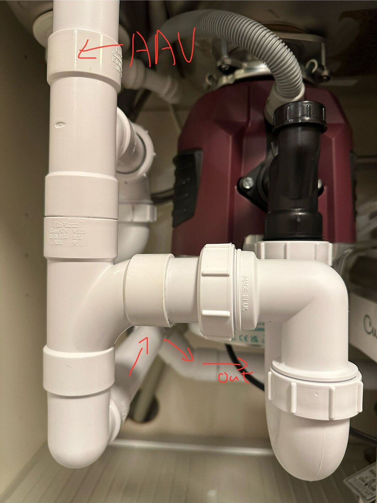 2. Photo 2 – close-up of AAV position and connections after the P-trap.