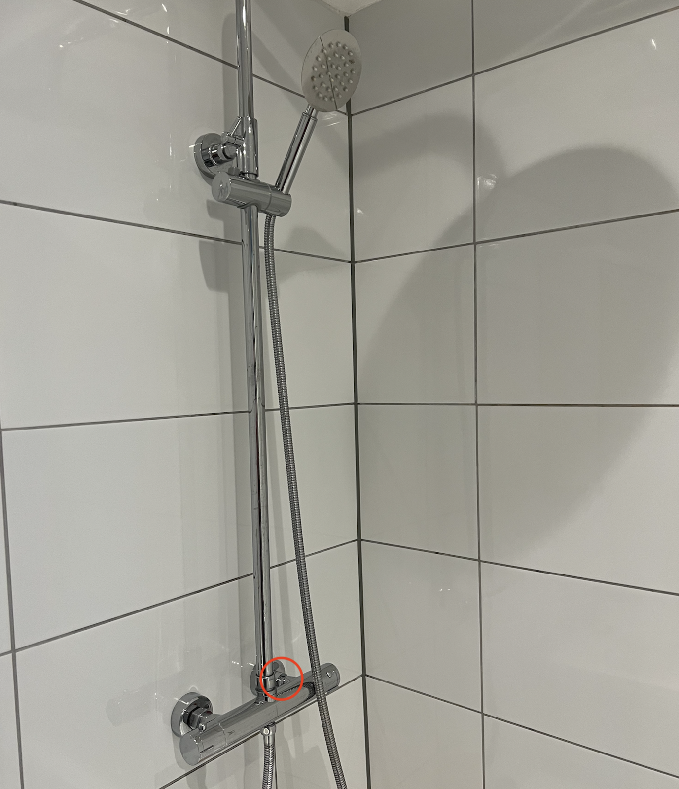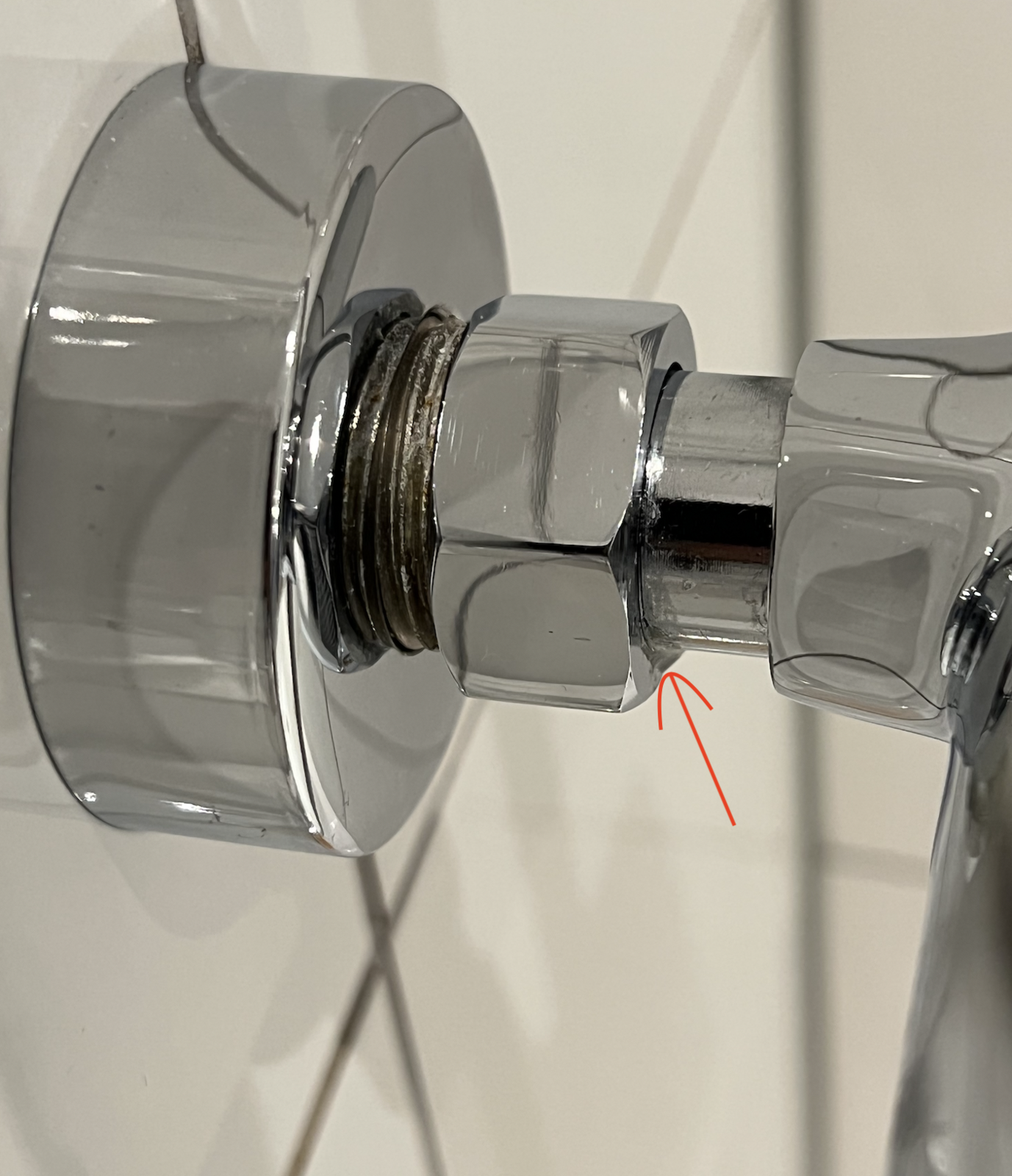 The shower is connected to the wall as shown - the knob on the left is to turn the shower on and the knob on the right is to control the temperature. Where the shower is connected to the wall on the 'temperature knob' side, there's a very slow leak/drip coming out of the fixture as shown by the arrow in my photos.
