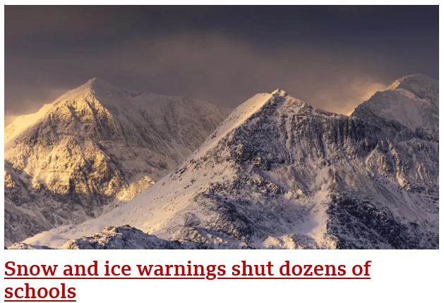 What a picture of Snowdon has to do with schools closing, I don't know, ask the BBC, but clearly snow is causing problems, just been out and blown it off my drive so safe for postman etc. Leaf blower does a great job.We expect post, milk, bins, etc, to be affected by the snow, but why would schools close? It has a knock on effect, schools closed, so parent can't go to work, and I remember as a boy come what may, we still went to school, unless something like the boiler failed, everyone walked to school, and snow would need to be one foot or more, before it stops us walking.