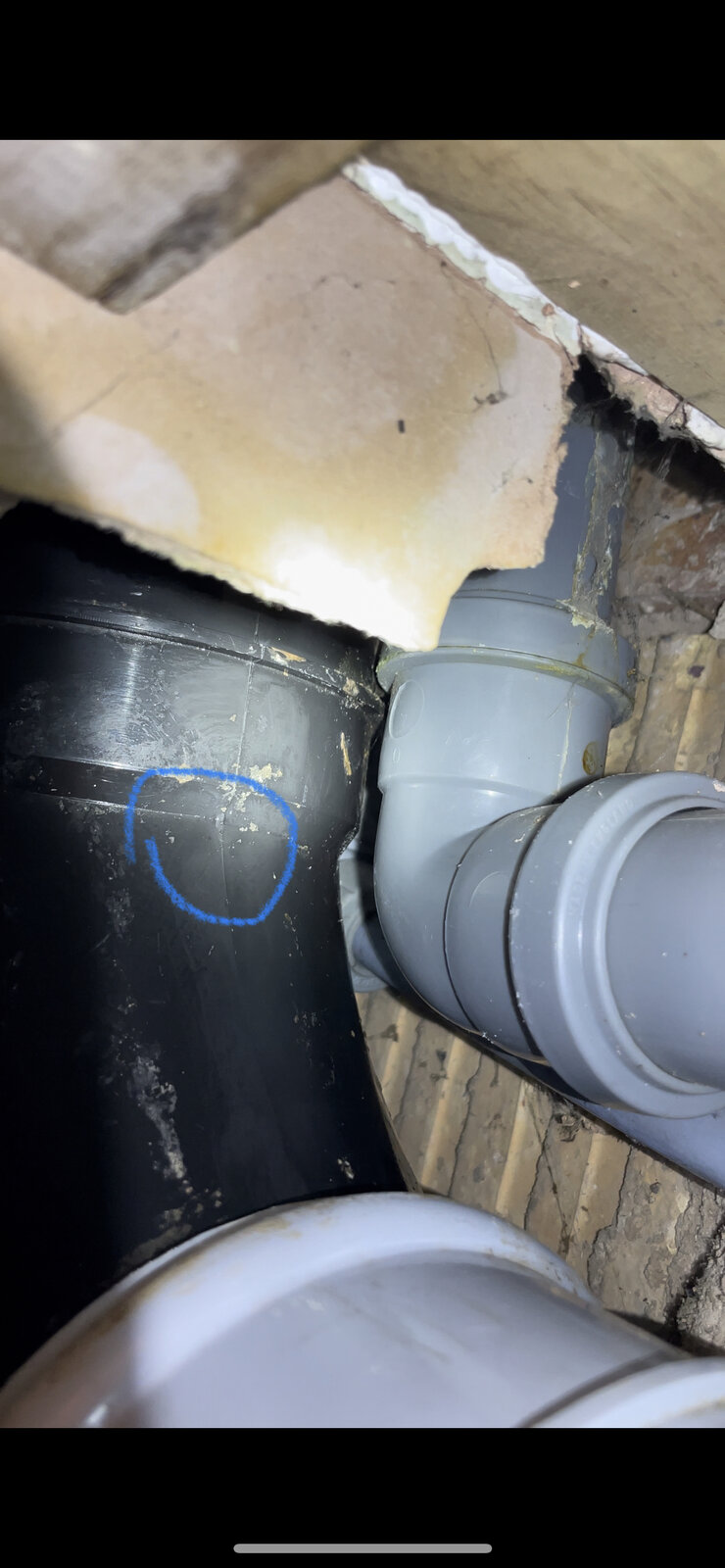 The elbow and the soil pipe were all dirty and I could see water in several places but I couldn’t see where it was coming from; after cleaning everything, I managed to identify the source in the circled area (where the two sections making up the elbow meet). After cleaning it the leak seems to have become less serious, maybe because I’ve filled the pinhole with all the sludge