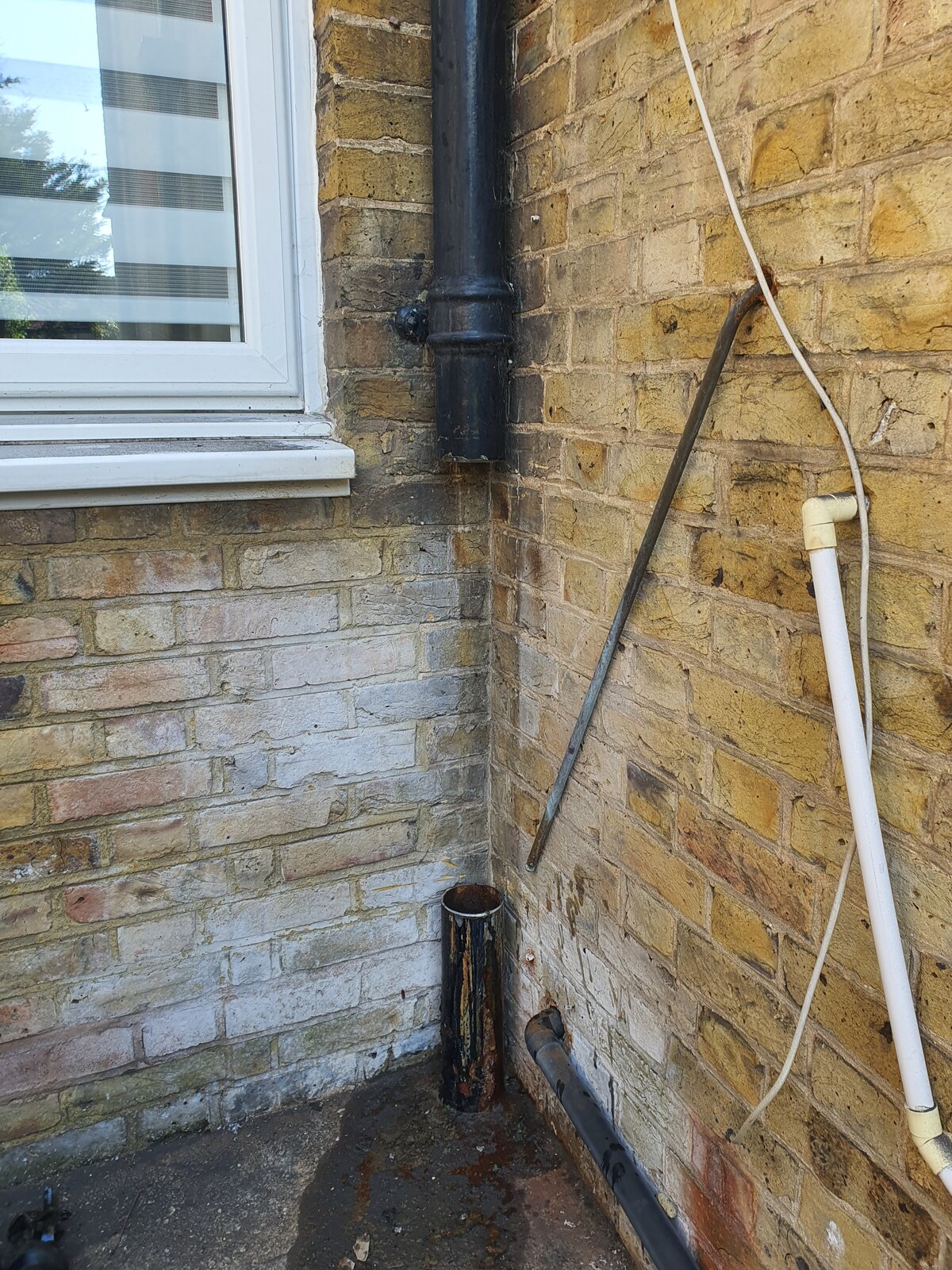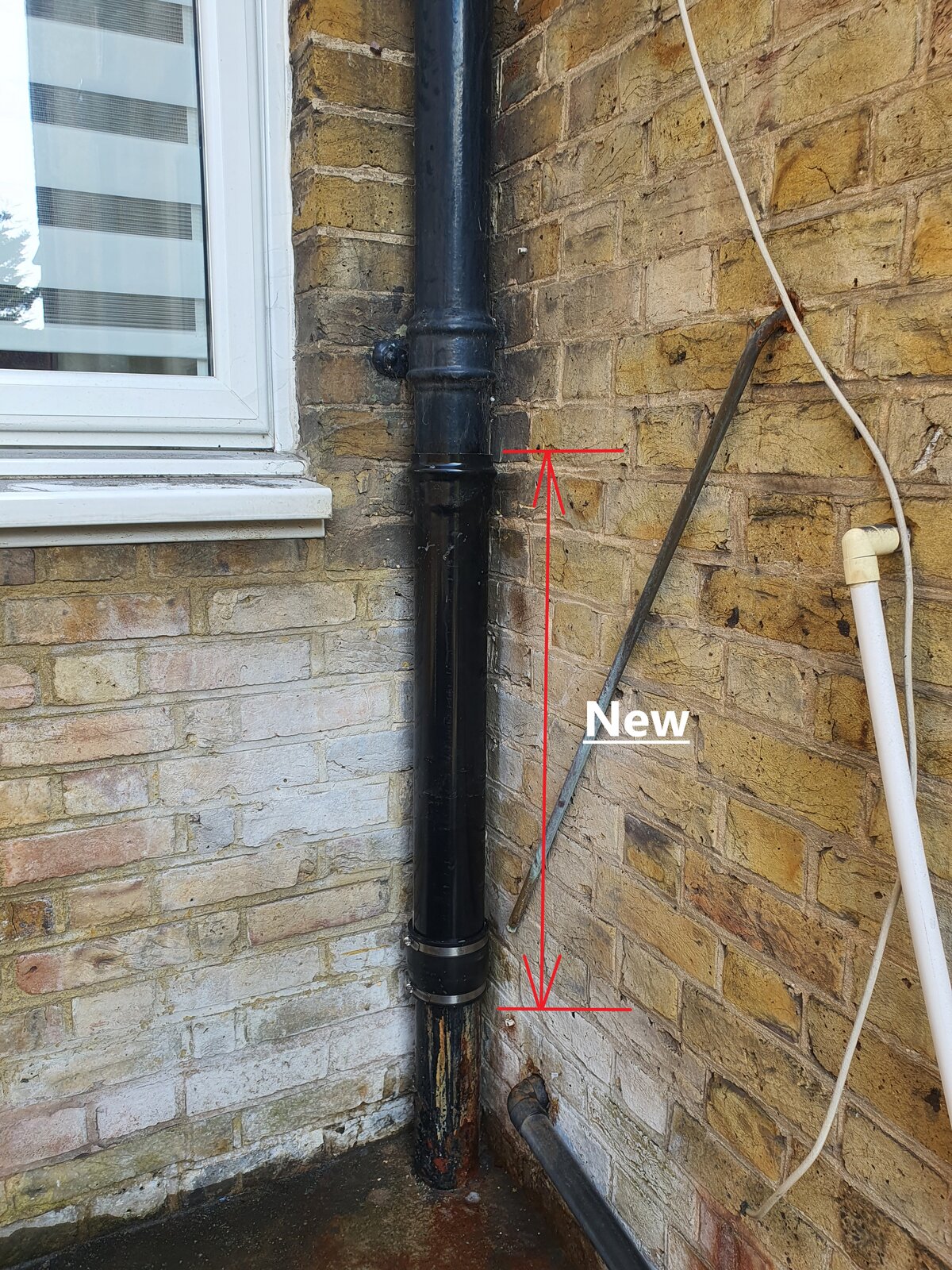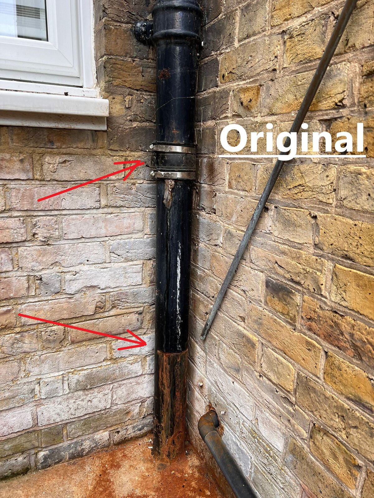 In the original photo you can see there were 2 cracks in the cast iron pipe. When the drain got blocked, the water nearly backed out out the 1st floor toilet, and leaked through these cracks. Previous person put an ill fitting flexible coupler on the pipe.