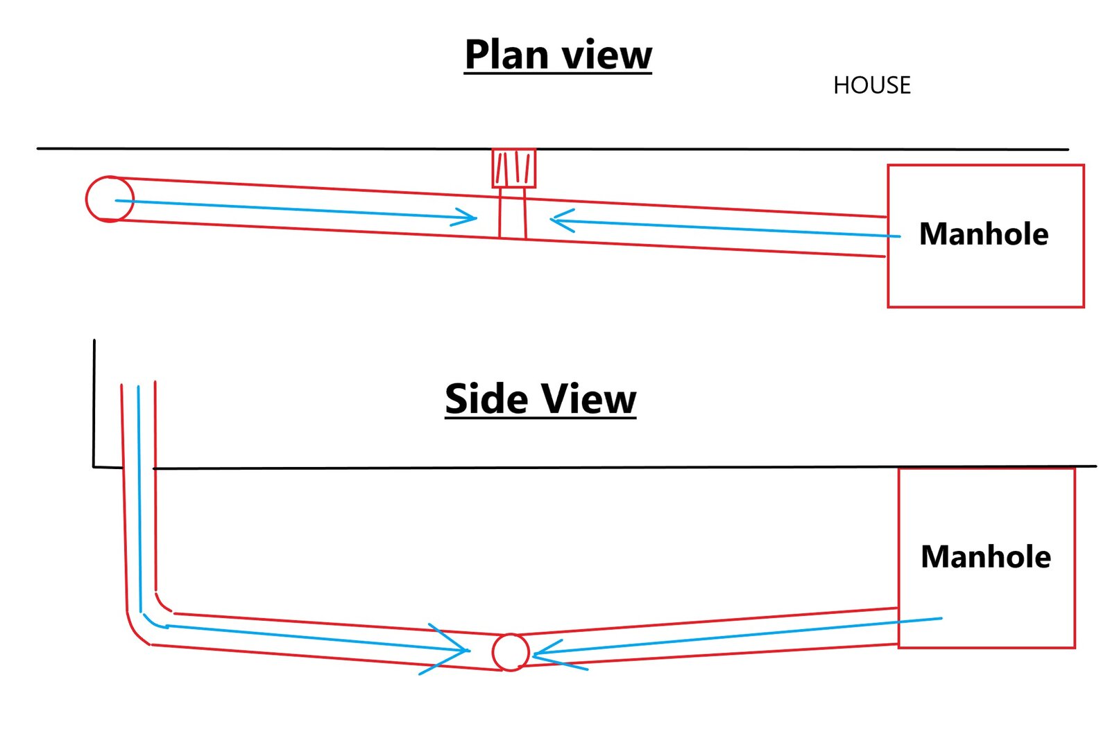 Rather than pay that, we cut out the damaged section of pipe. If you look at my diagram, you'll see you can't rod it around the elbow, nor from the manhole which slopes in the opposite direction.