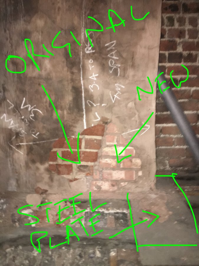 Update .... the SE has been round and said to take out a few coarses and look what's going on .... It seems the corballed brickwork has been repaired and this metal plate some kind of bodge job support :(