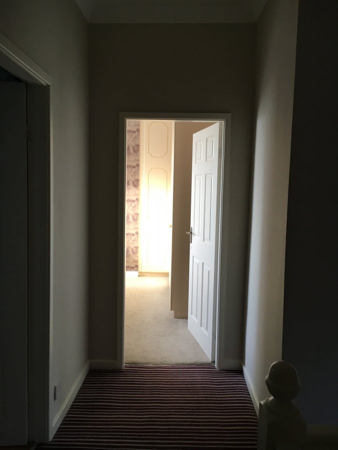 This is outside the room looking in currently ... The stairs are going where the wardrobes are and a partition wall to divide the room ( with a the right angle door into this room on the left )