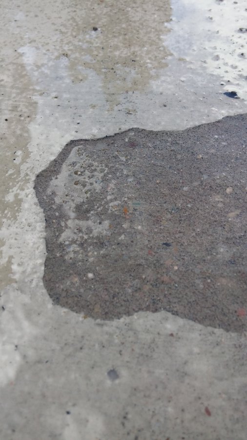 Well no surprise my concrete mixing/finishing skills still need a lot of work because patches of the slab have started to spall and are a bit sandy. I've attached a photo. Probably only 1/4 is affected and it is in small patches not all over.