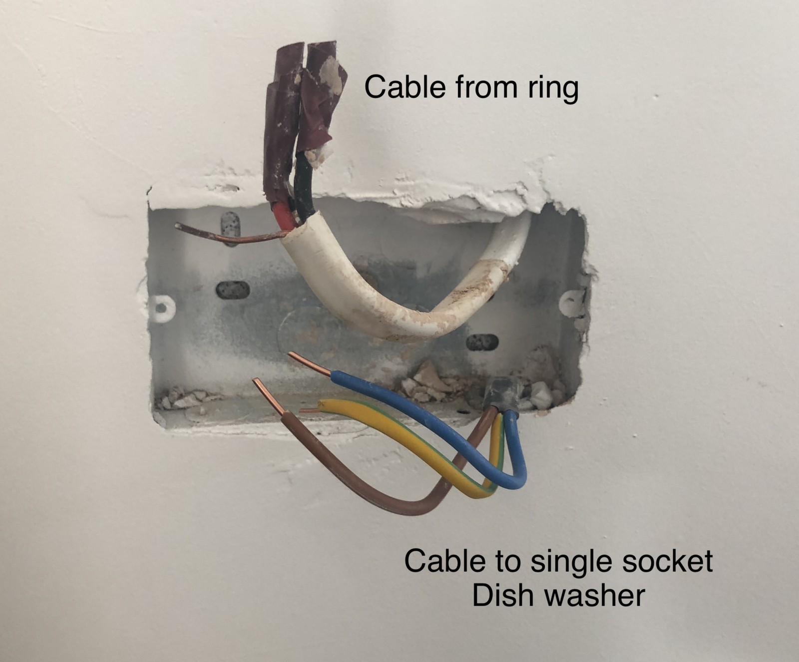 There was a double socket that I removed. There is one wire coming down from the main ring (white). Wired on to it there was another spur with more recent cable (grey). That one goes in to a socket behind the cabinets for the dishwasher.