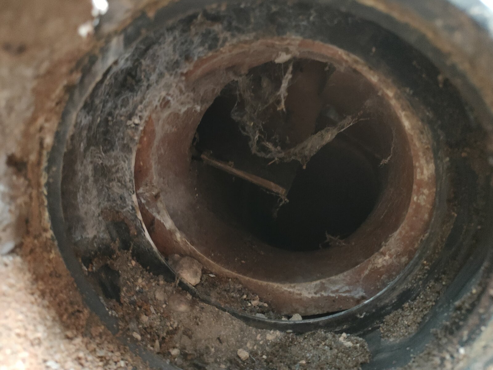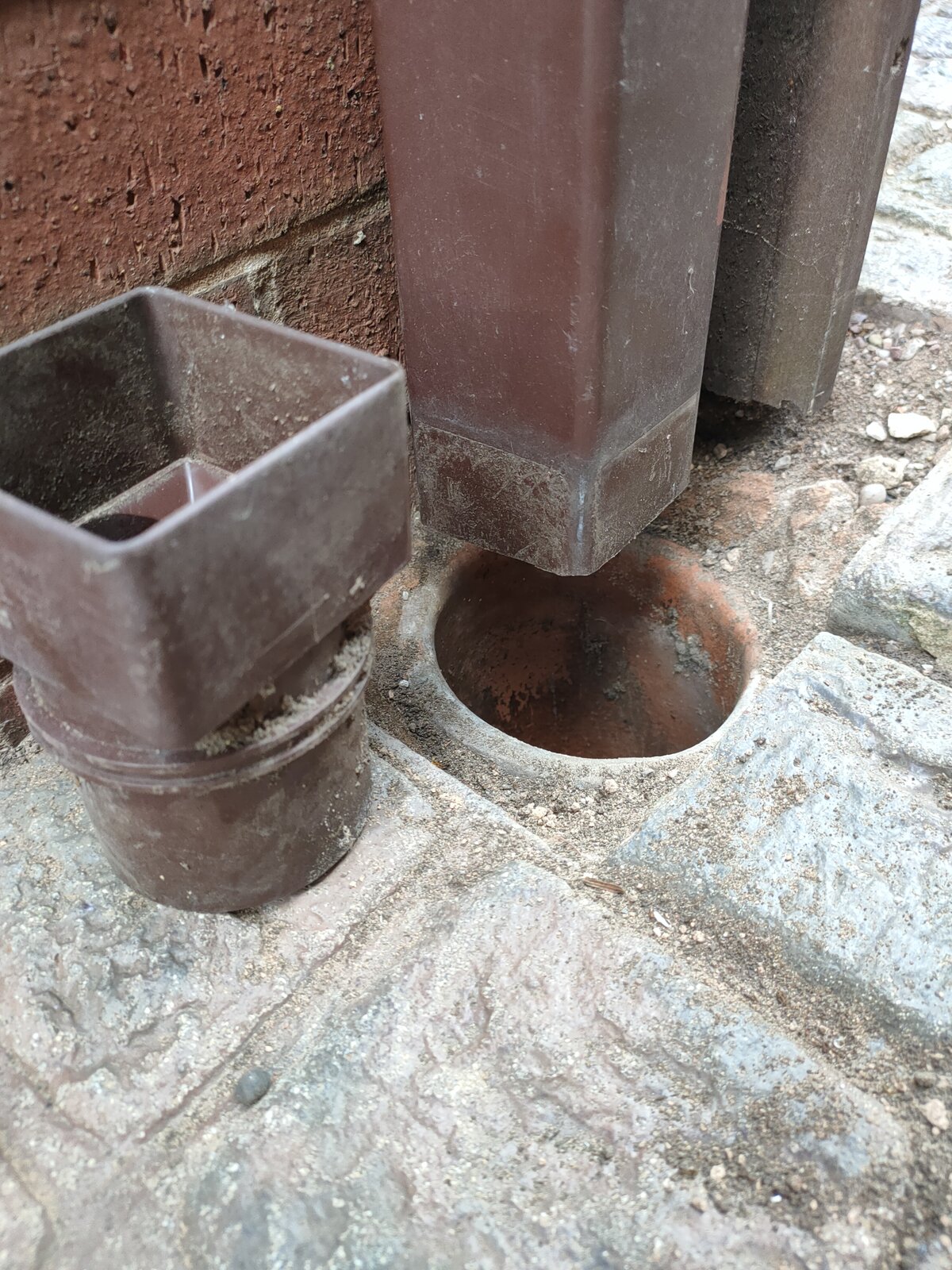 Pushed around the side of the downspout was plastic bags and someone just cemented on top of the plastic around the downspout.