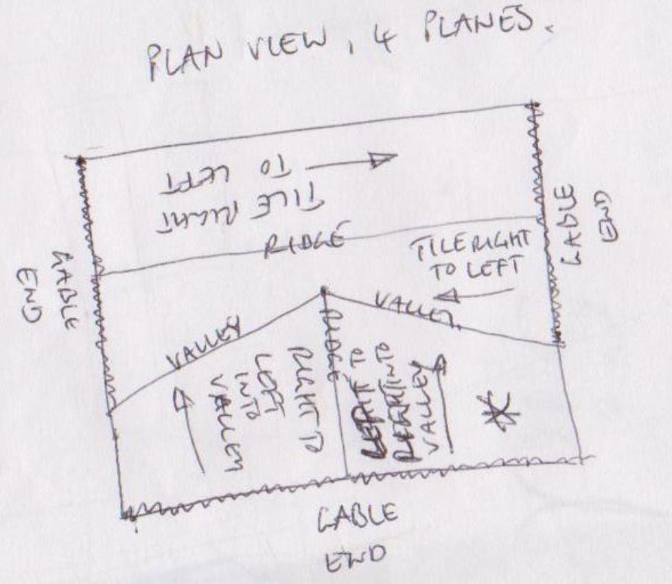 The tiles are specc'd to be laid from right to left. However, where verge is on the left and a valley on the right hand side of the roof plane, do I just do left to right instead? Or should I string a vertical line down from the ridge, ending at the base of the valley, allowing a square section of tiles to be laid right to left, then return to the valley area to infill?