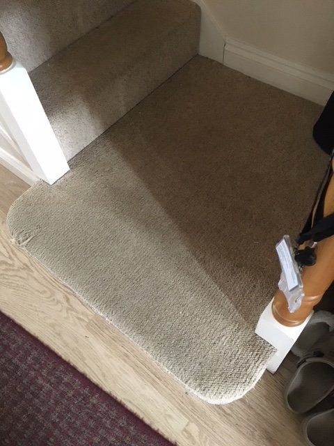 My second is regarding the landing bottom step - I have seen you can buy replacement bottom steps, and from looking at our newel post, it would look like that if we removed the landing step we would be left with some exposed routing that is there to support the bullnose that is proud at the bottom - I gather that this would be easy to infill? I think I would have to chisel in a vertical to support the new bottom step? (see picture) or should I go for a curtail step which hopefully would be the same size to fit the existing channels.