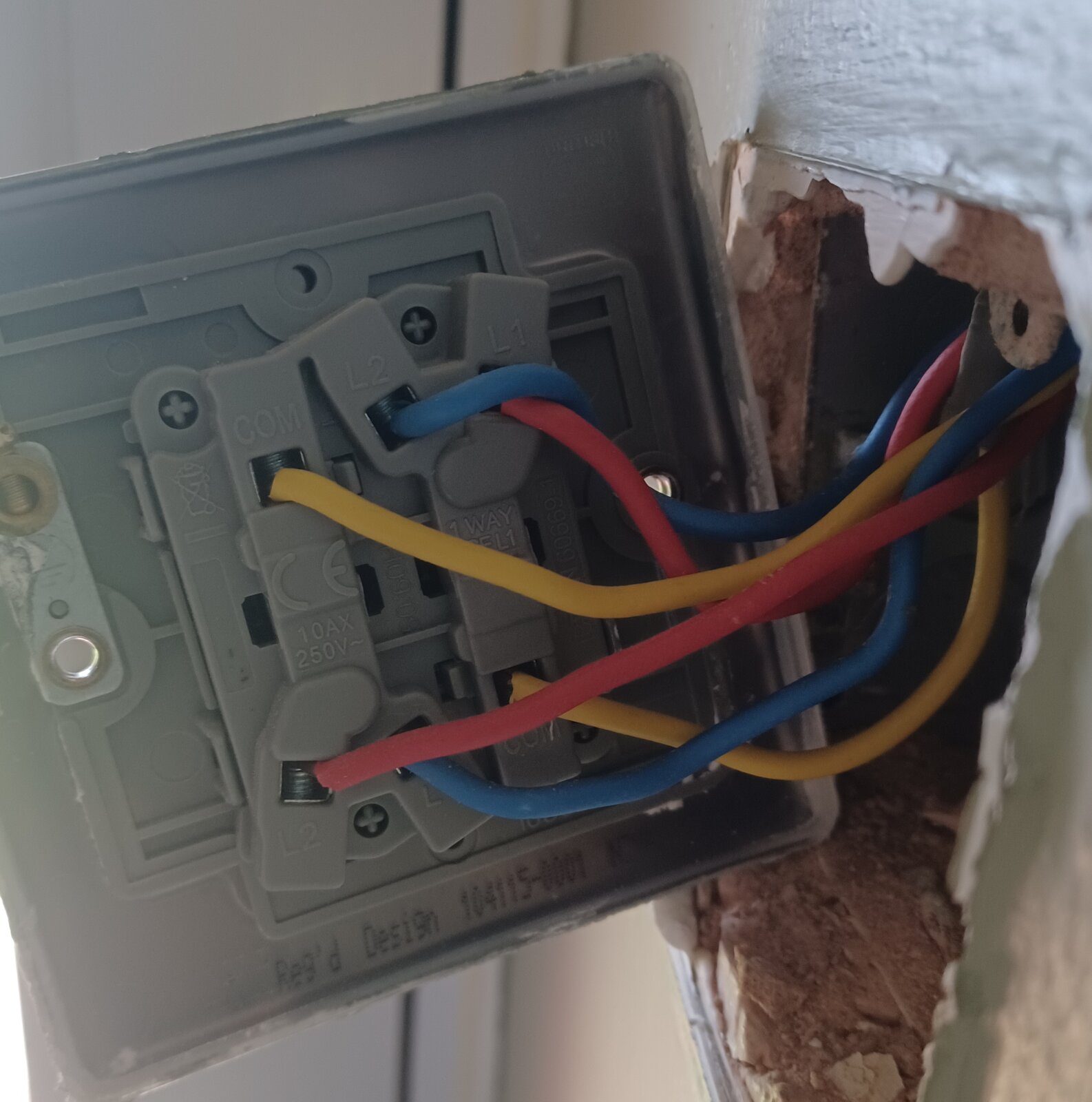 This is the downstairs hall light switch - 1 switch for upstairs and the other for downstairs. There is a 1 gang 2 way switch on the landing and the same the other end of the hall