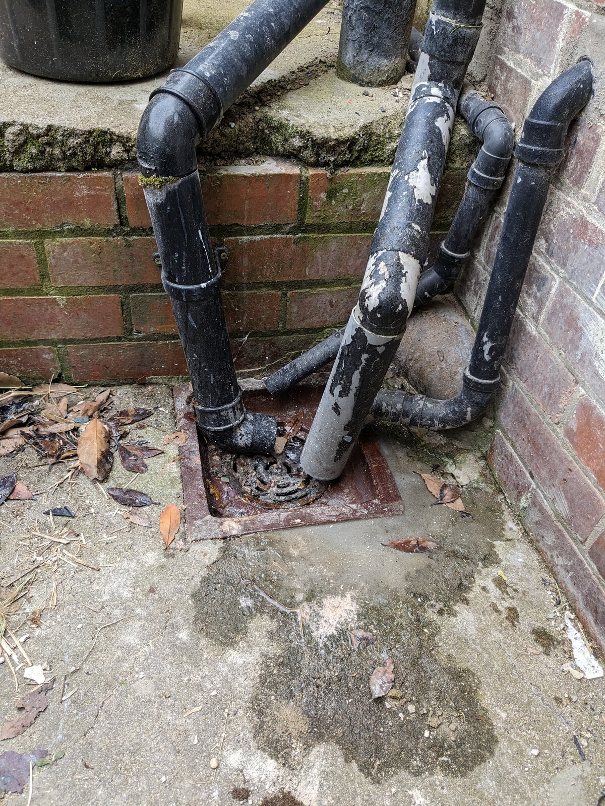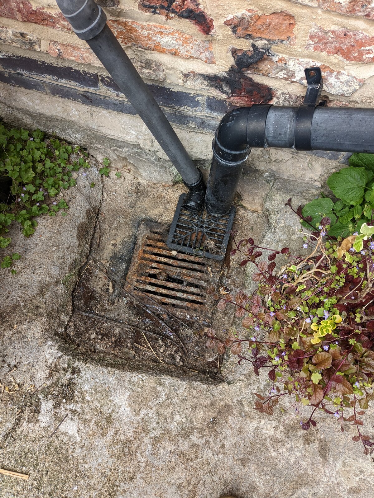I've got two outside drains and both have quite a lot of standing water around them, which can get worse if I forget to unblock frequently. Is there any way to prevent it? Drain one the metal grate sits slightly higher than the concrete - should I just redo the concrete to make it higher? Pic: