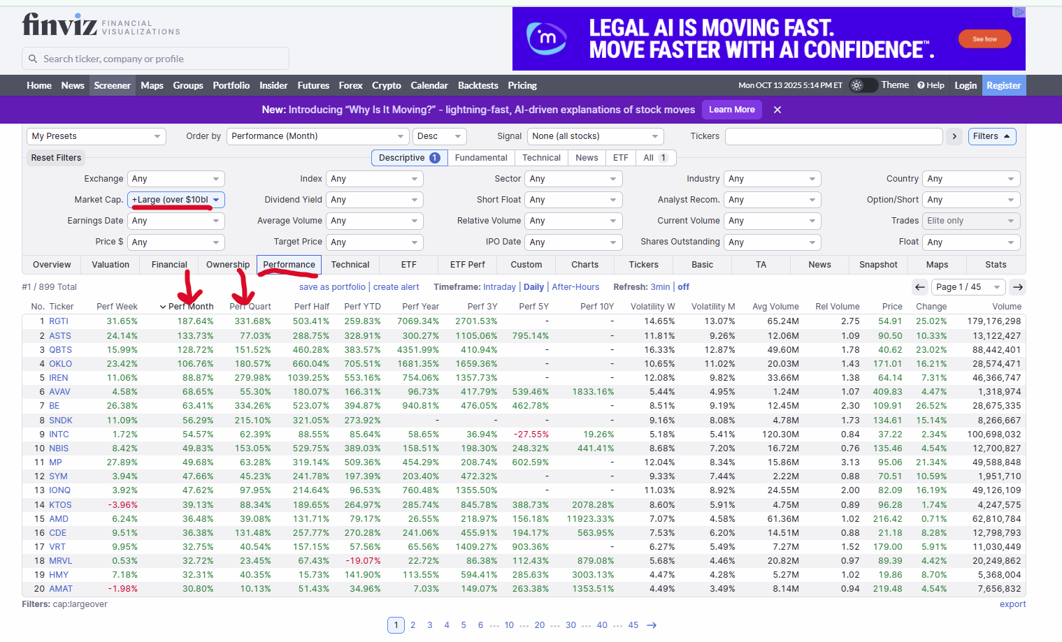 Start with a screener like FInviz stock screener. Set size ( m,arket cap ) to 10bl+ , = biggish co's, so you get a performance screen like this: