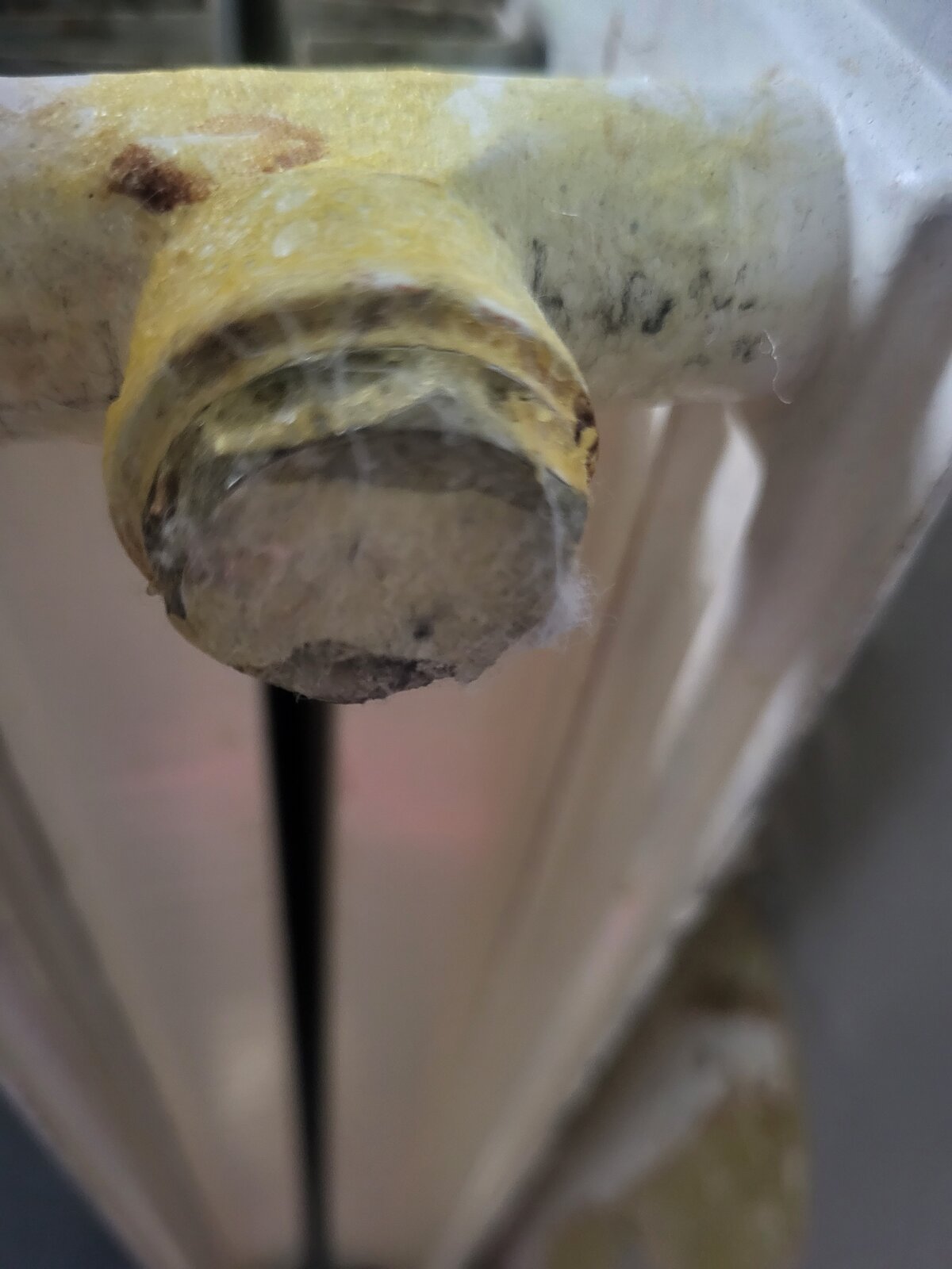 Once there's no more pressure, unscrew both top valves, clean the radiator thread and replace with new valves.