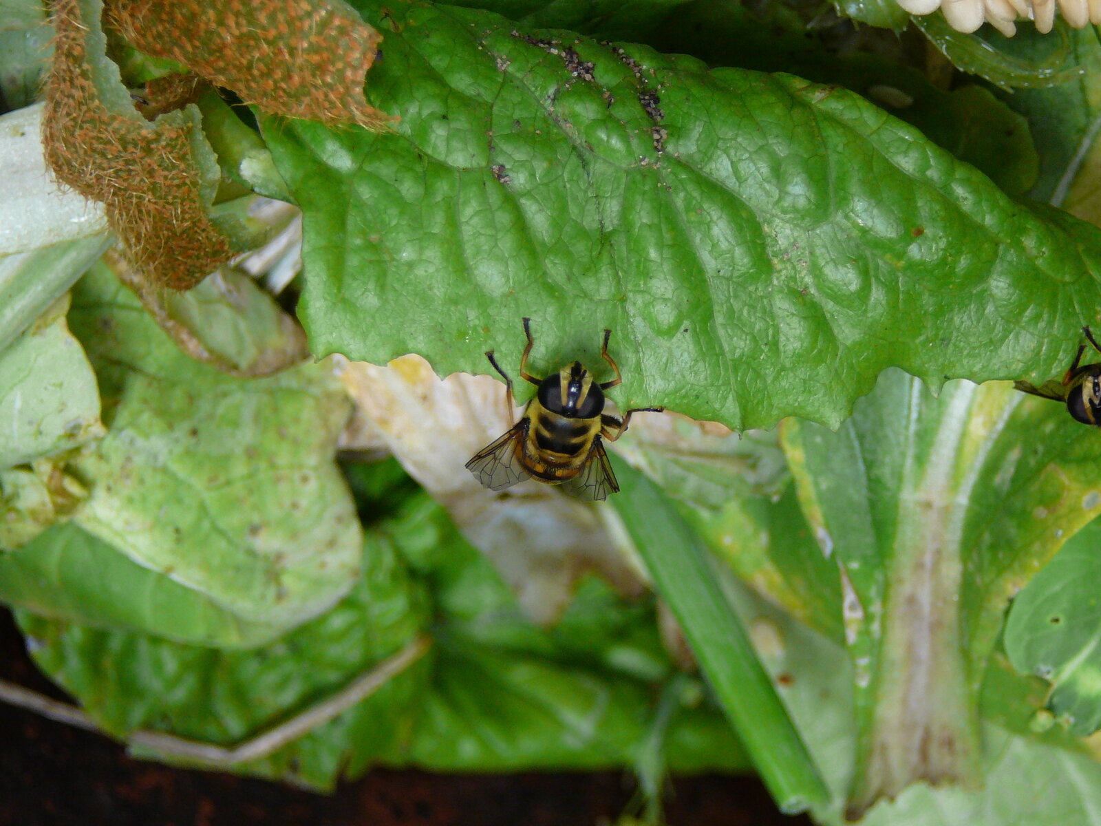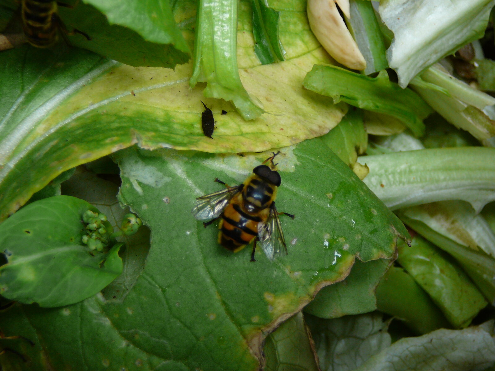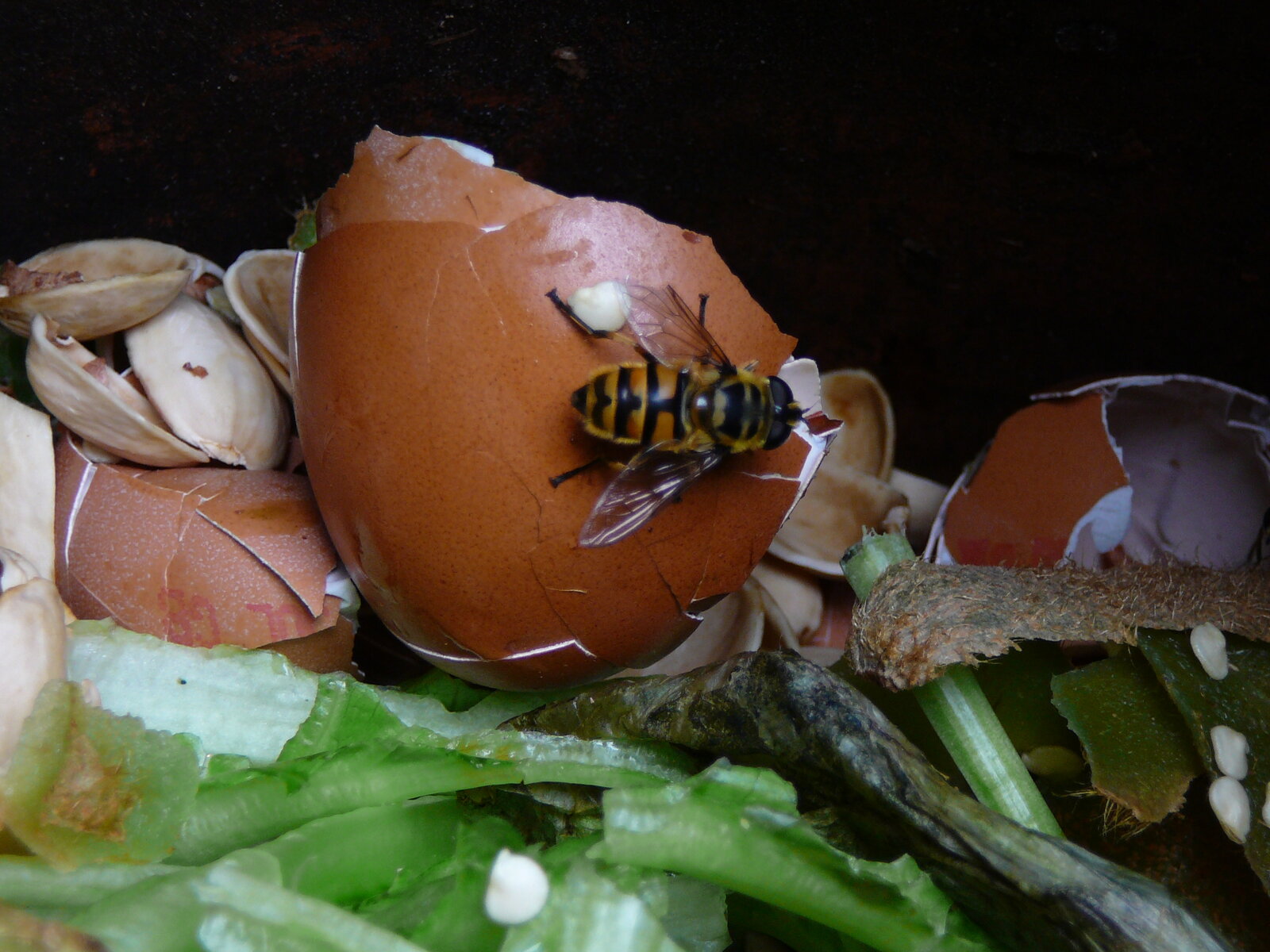 These have appeared in my compost heap, about the size of a wild bee but not hairy, stripy like a wasp but not aggressive, anybody know what they are please ?