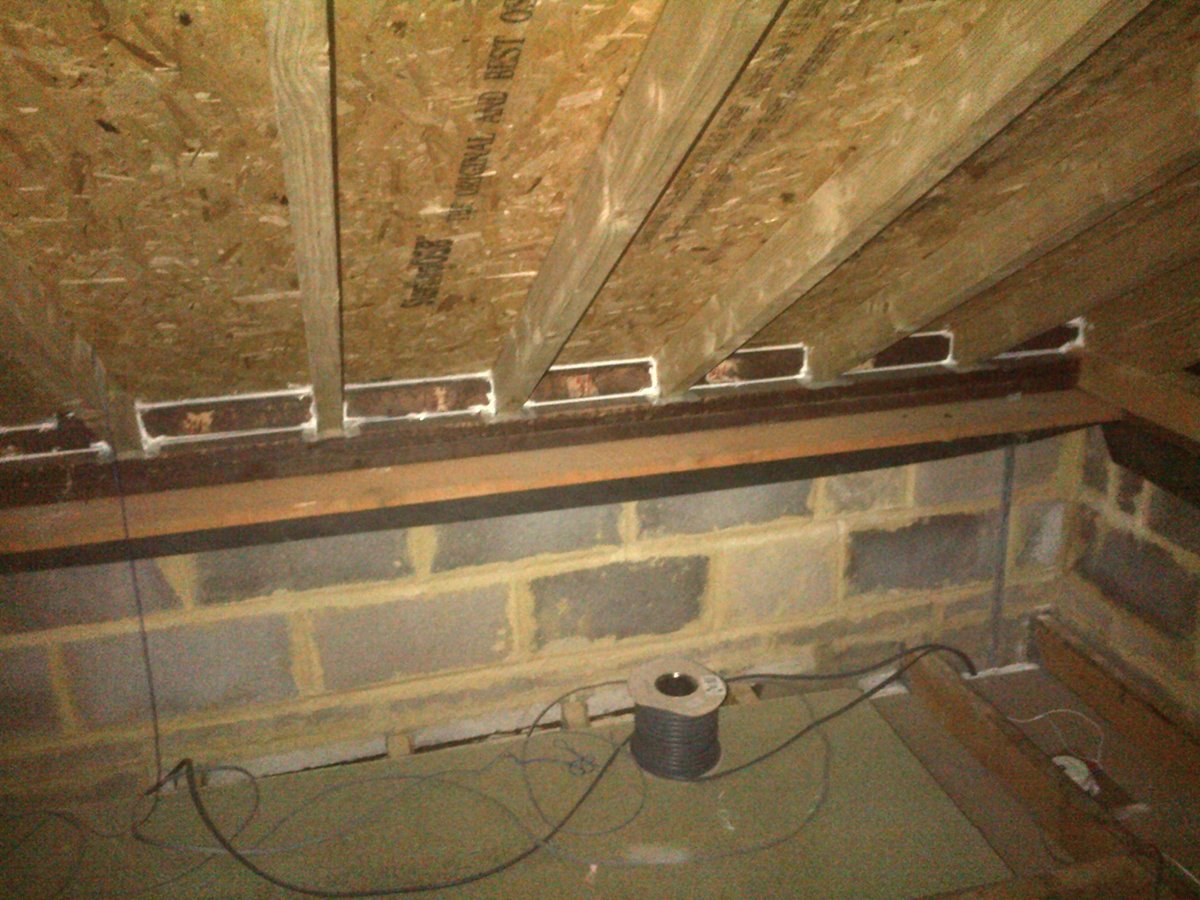 To make the situation more akward the building has a substructure which involves a 50cm tall tanking wall (building blocks laid on their sides) then at ground level it goes into the single skin/ half brick wall all the way to the eves. 2 blocks before the eves I added mortar joist hangers and created a small upstairs room/attic. My fix was going to be running a few fence posts from the foundations upto underneath these joists and then somehow fixing the post into the wall. If need be I shall strip back the plasterboard and add a pier on the inside or strip back the cladding and add a pier on the outside but im hoping thats not nessacary.