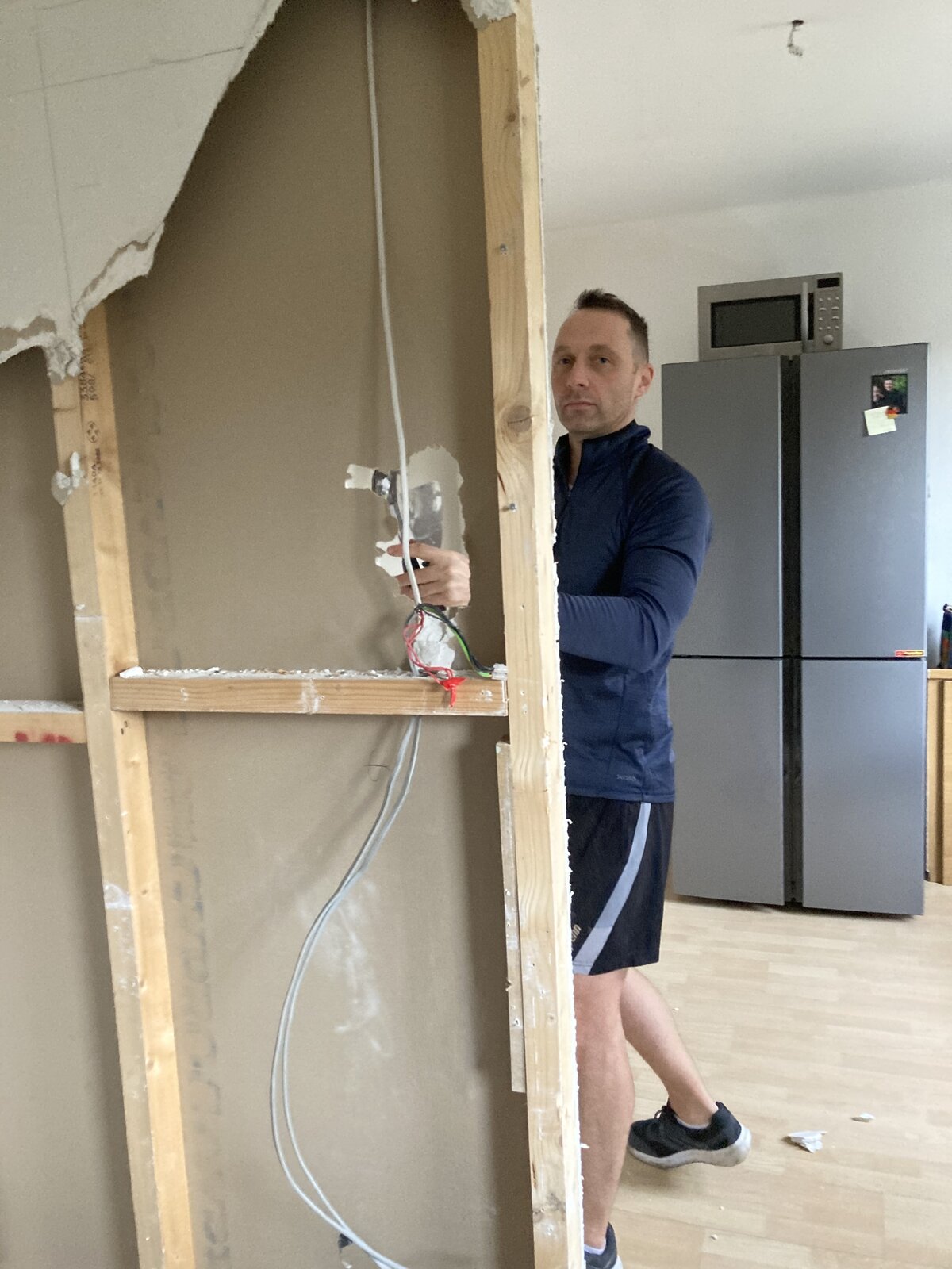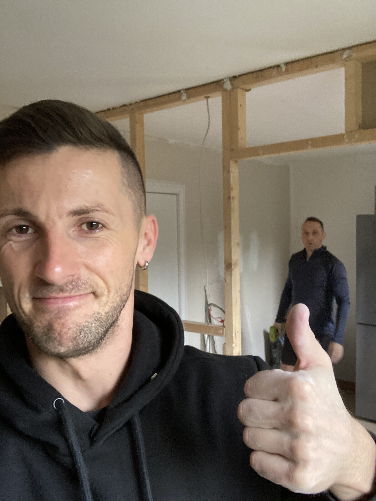 So we have removed plasterboards of this wall . I’ve noticed that this wall timber construction was seating on the top of plasterboards there was a tiny little gap between ceiling and timber. And sides of this timber frame were same on the top of plasterboards. Top corners of this wall was attached by 1 black nail on each side and rest of this wall was screw or nailed to plasterboard. Bottom of timber frame was attached to floorboards with nails. Beams on top floor go this same way as this partial wall I wanted to know down.