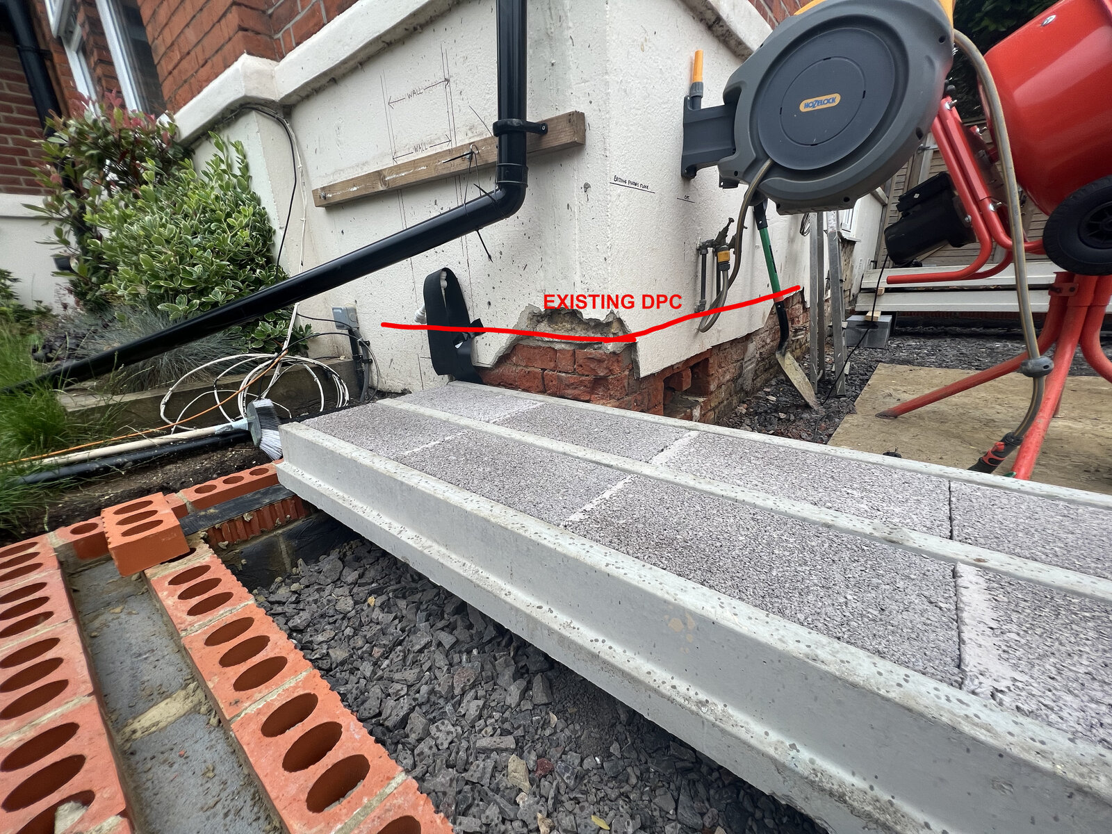 I'm not 100% sure what to do, but my initial thought would be to cut into the mortar of the existing DPC, and then get a 400mm wide DPC and slot that in and drape it down the side of the existing wall as an barrier between the wall and the new insulation and screed that will sit on top of my beams. When i concrete infill the bit of beam which is parallel to the existing wall, I don't want to bridge it, so my draped DPC will prevent that. Nor my screed, which would bridge the DPC too if I don't have the vertical DPC draping.