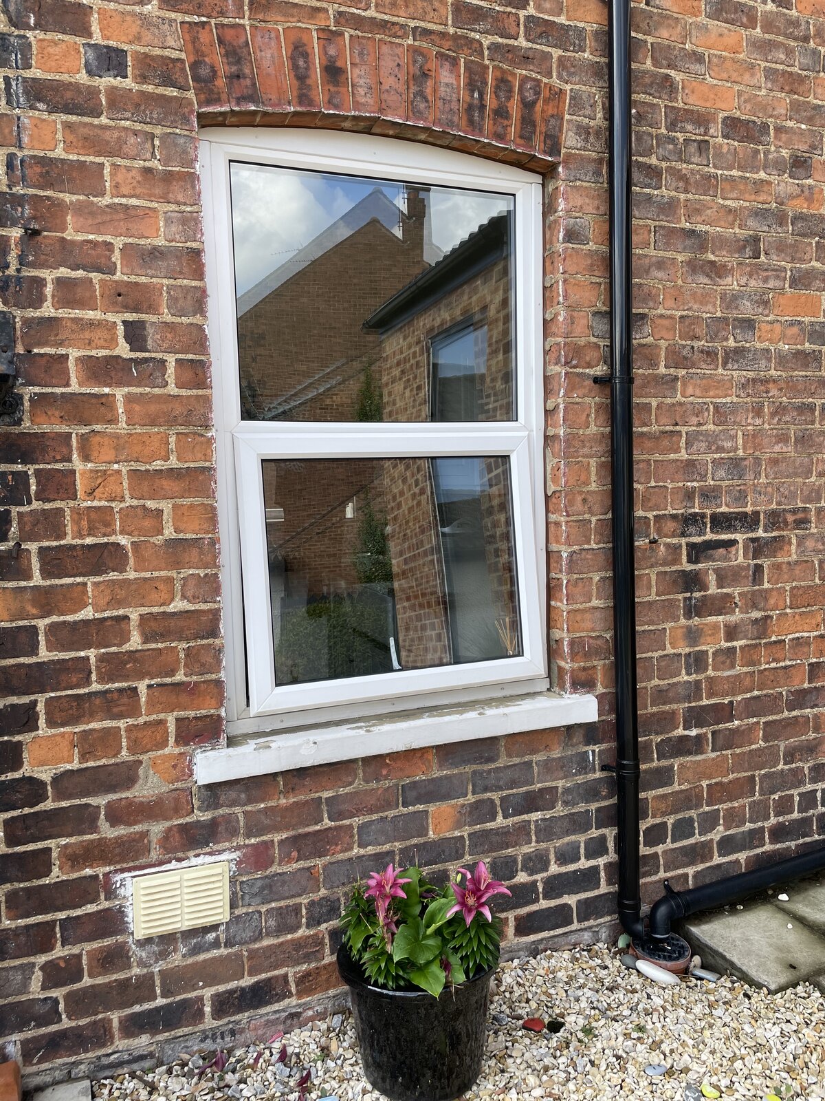 The patio has been removed below window presumably as this is where the previous owners planned to open up to an extension (which we haven't done) and I'm assuming the builder/architect did this. Photos are inside / outside of the same window.