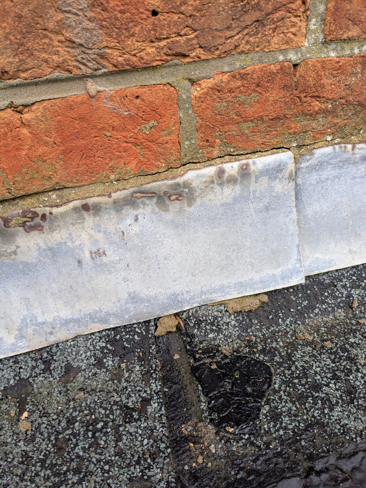 Ancient asphalt roof aside - I note the mortar in the flashing is cracked roughly near where the leak occurs ( only during excessive rain ).