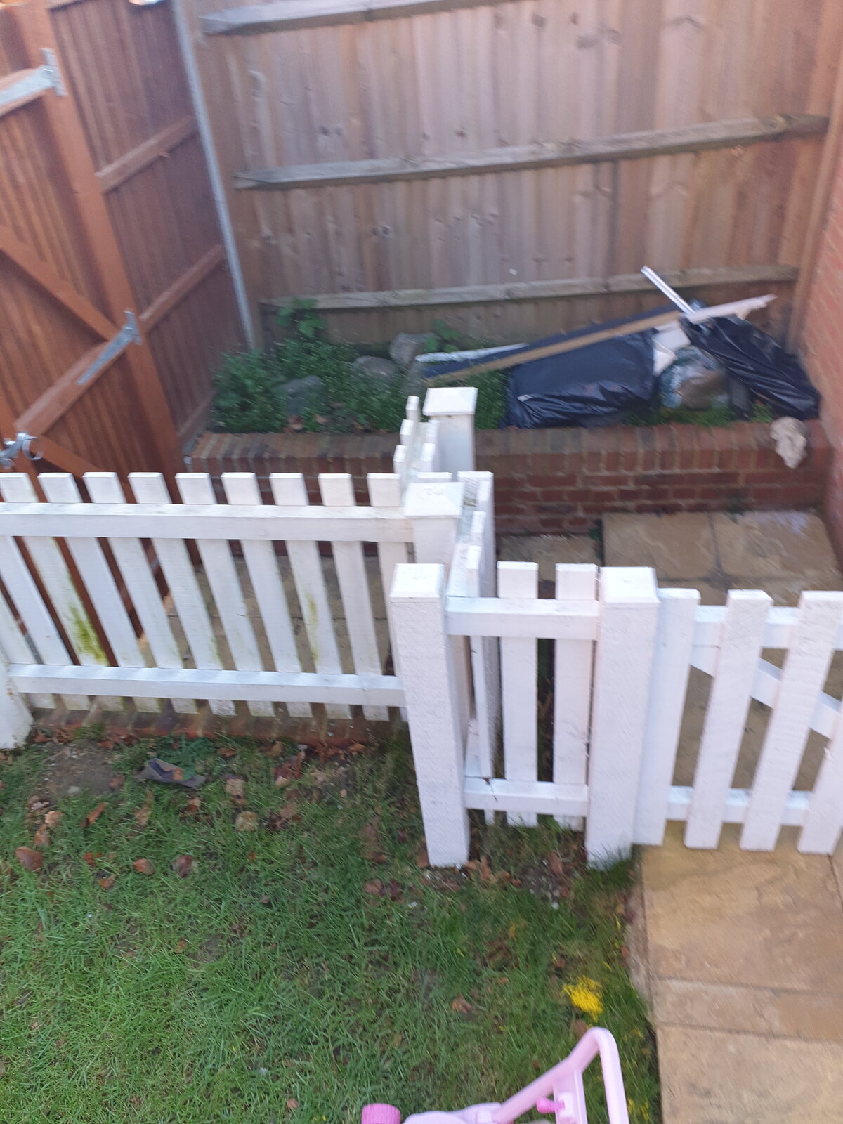 It's enclosed on 3 sides with a wall to the neighbours garage on the right, the neighbours fence at the back, plus our fence/gate leading to our drive/garage on the left.