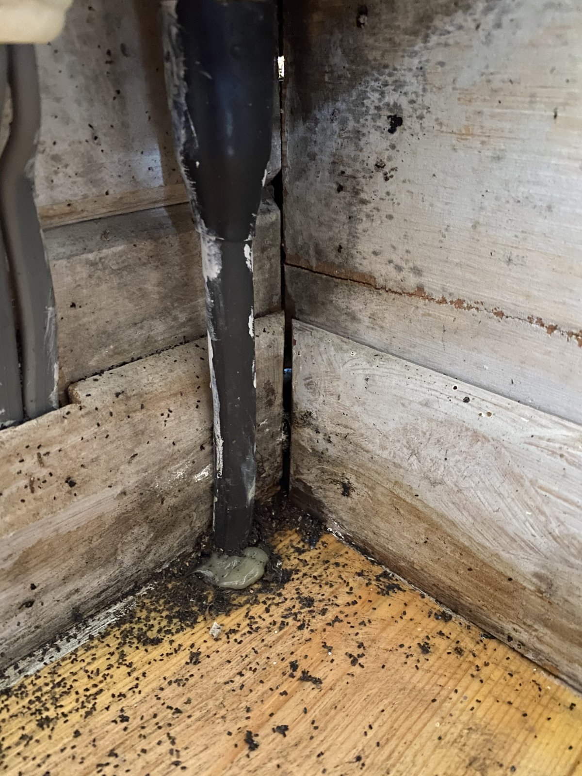 1. Inside: corner is cracked and you can just about make out daylight. Woodlice are roaming around!