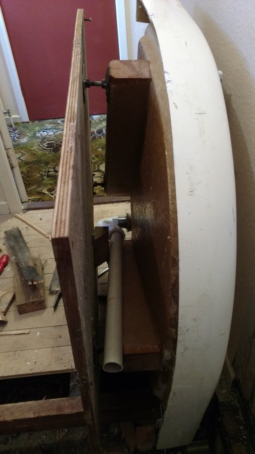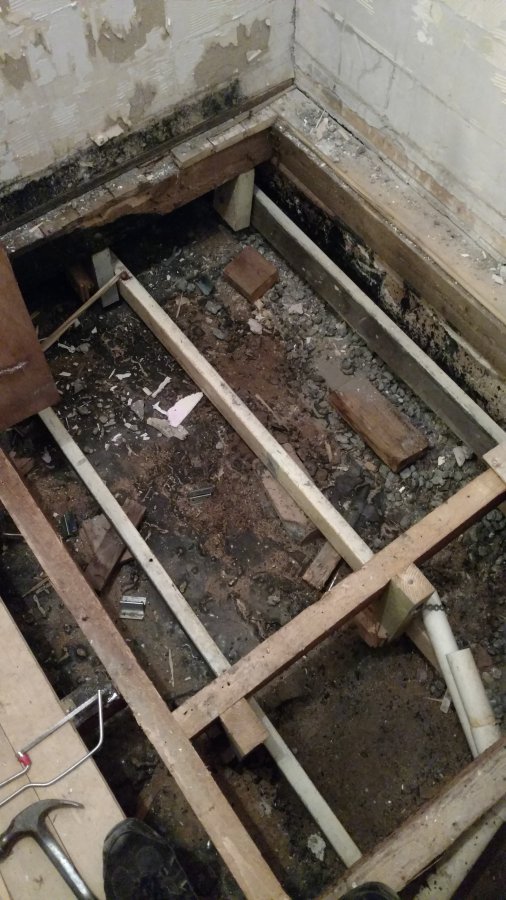 Joists cut out, theres a drop down cradle for a plywood sheet to sit on which has the shower tray legs bolted to