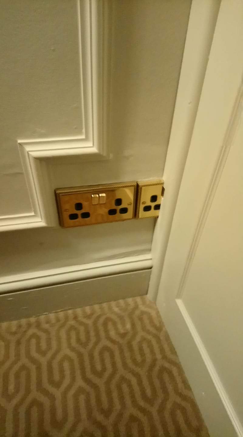 As with the cases one hears of (one of which I personally witnessed) of the only entrances into a room being totally bricked up during a new build (and then plastered - totally concealing the existence of the room!) one has to ask some very serious questions about the sanity, intelligence and mentality of the person who actually did it - no matter what the plans might indicate!Double whammy, sockets where door is going and the trim. Poor planning there.