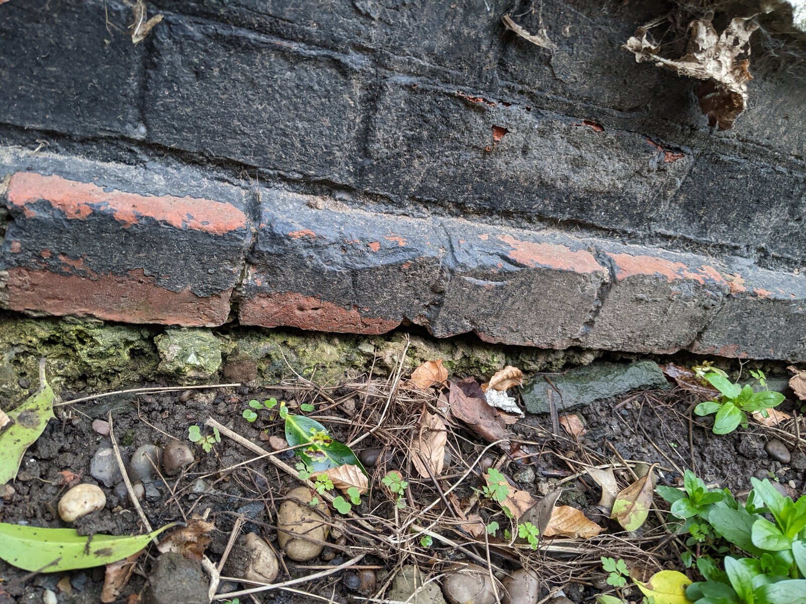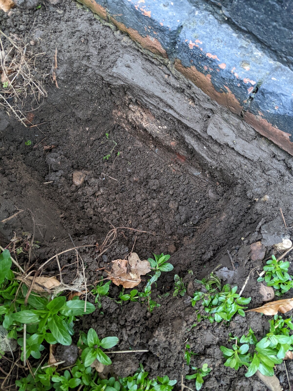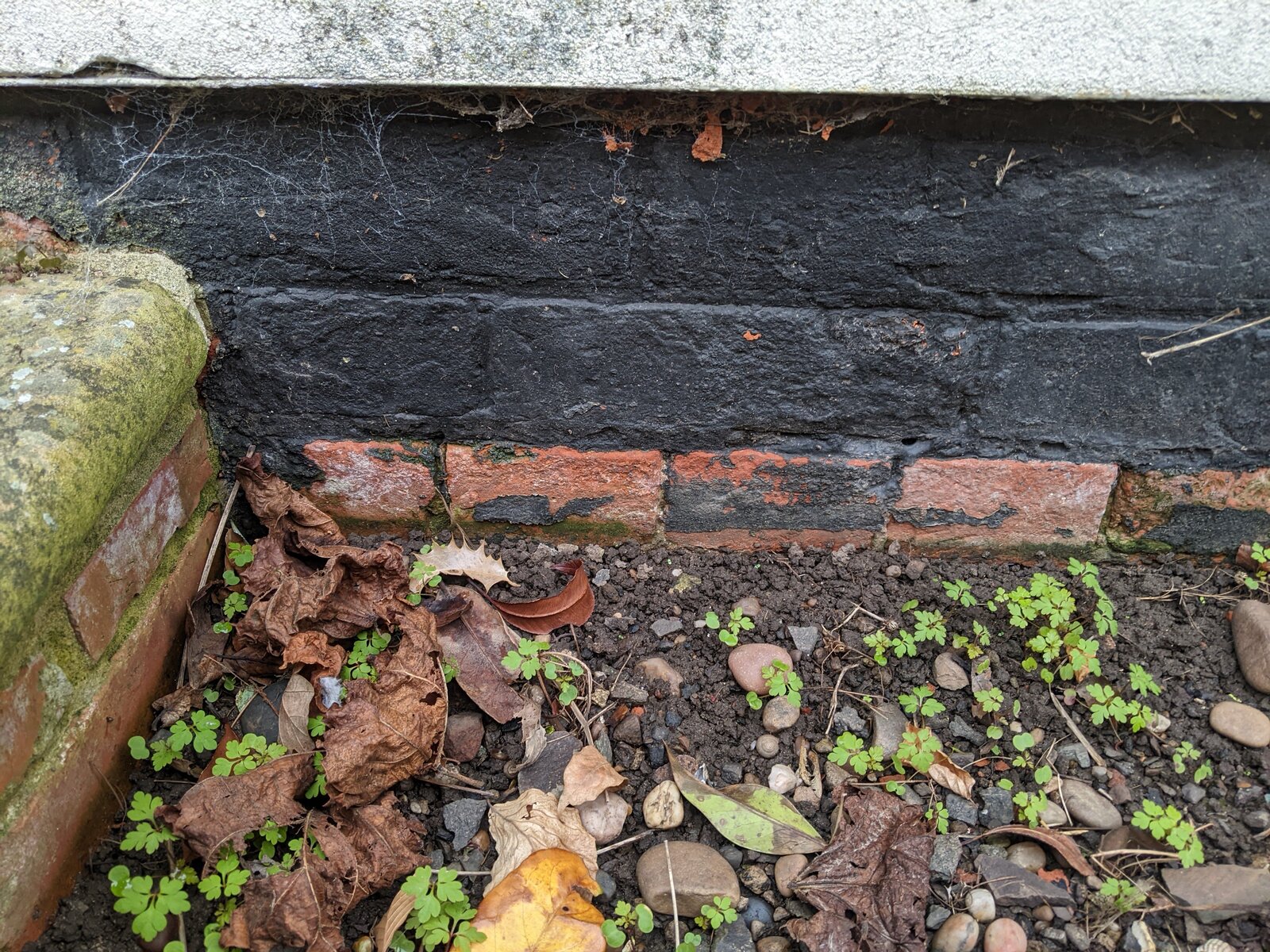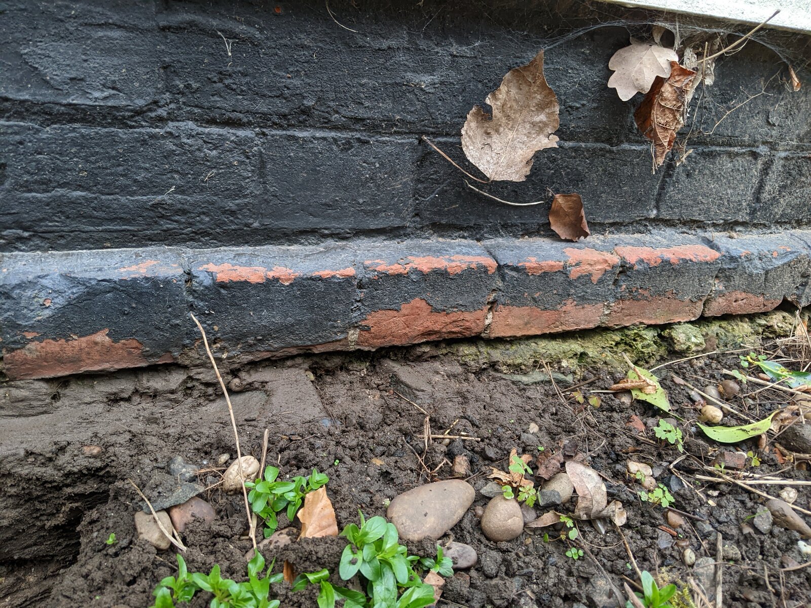 Support for the bottom course of visible brick is badly eroded at ground level on the front elevation due to frost damage. Cutting out and replacing the stone/ bricks may be at some expense as it is labour intensive. Engineering bricks would help prevent this problem reoccurring.