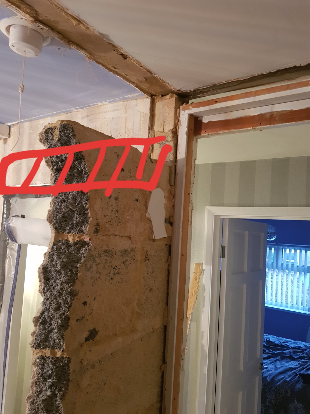 I've decided to knock a wall through from my bathroom into my airing cupboard to gain more room. Most of the solid wall (Breeze Block) has been taken down other then a section supporting a lintel above a doorway. The wall is not load bearing as it's been built on floorboards, I've also been in the loft and nothing is supported on top of it but when I remove the last section the lintel will only be supported by a very small part of wall. The lintel is red in the pictures and the wall left to take down is green. The other doorway in the picture will be borded up with a stud wall. Anyone have any ideas of how I'll be able to do it? Many thanks, James.