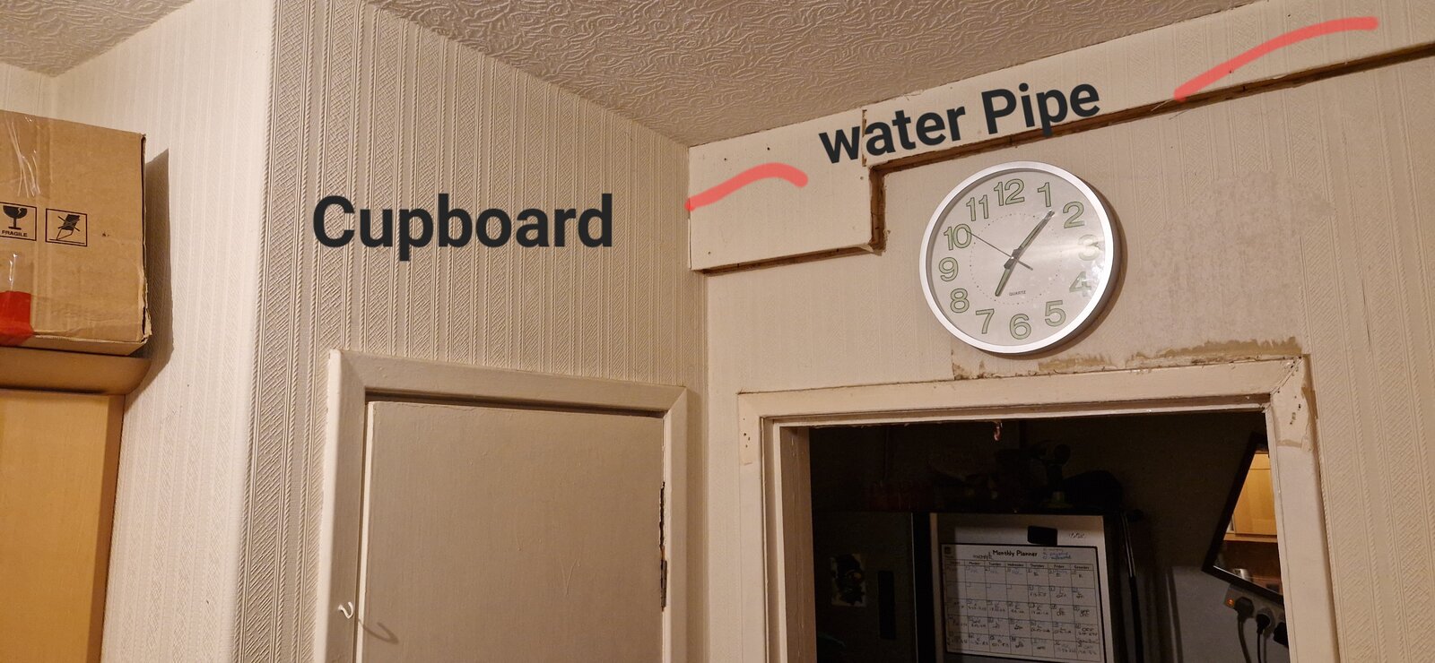 Just to confirm, looking at the previous photo - the dividing wall is the one with the clock on it; the cupboard walls have the cupboard door and the return wall (with boxes next to them). The new photo - which walls are they?