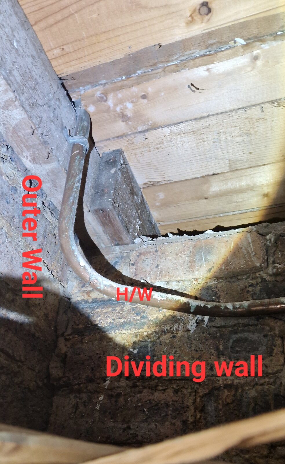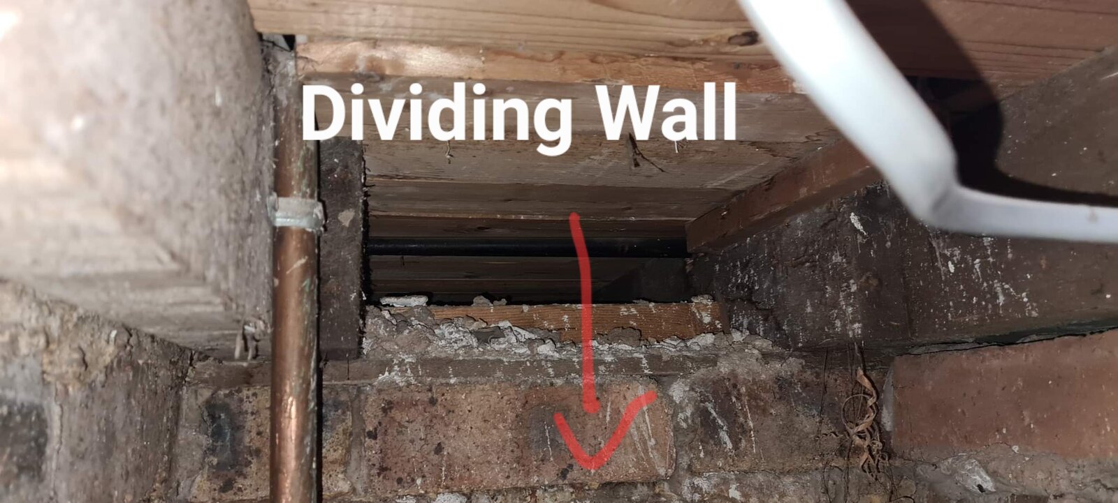 I was underneath today, replacing old pipe insulation and took a pic. Looks like the joists run the same way as the dividing wall. But could be load bearing for 1st floor joists.