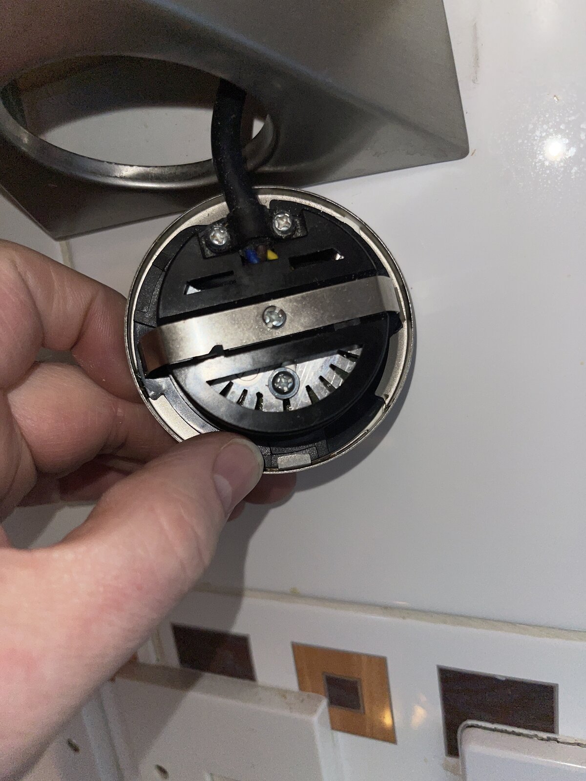 I am not an electrician and this is NOT my work. The under-cabinet light fitting is metal and plastic as can be seen in the first picture. There are live, neutral and earth wires clearly visible inside the fitting, however, at the other end, where the fitting is connected to the mains, the earth wire has been cut, ie. is not connected to anything.