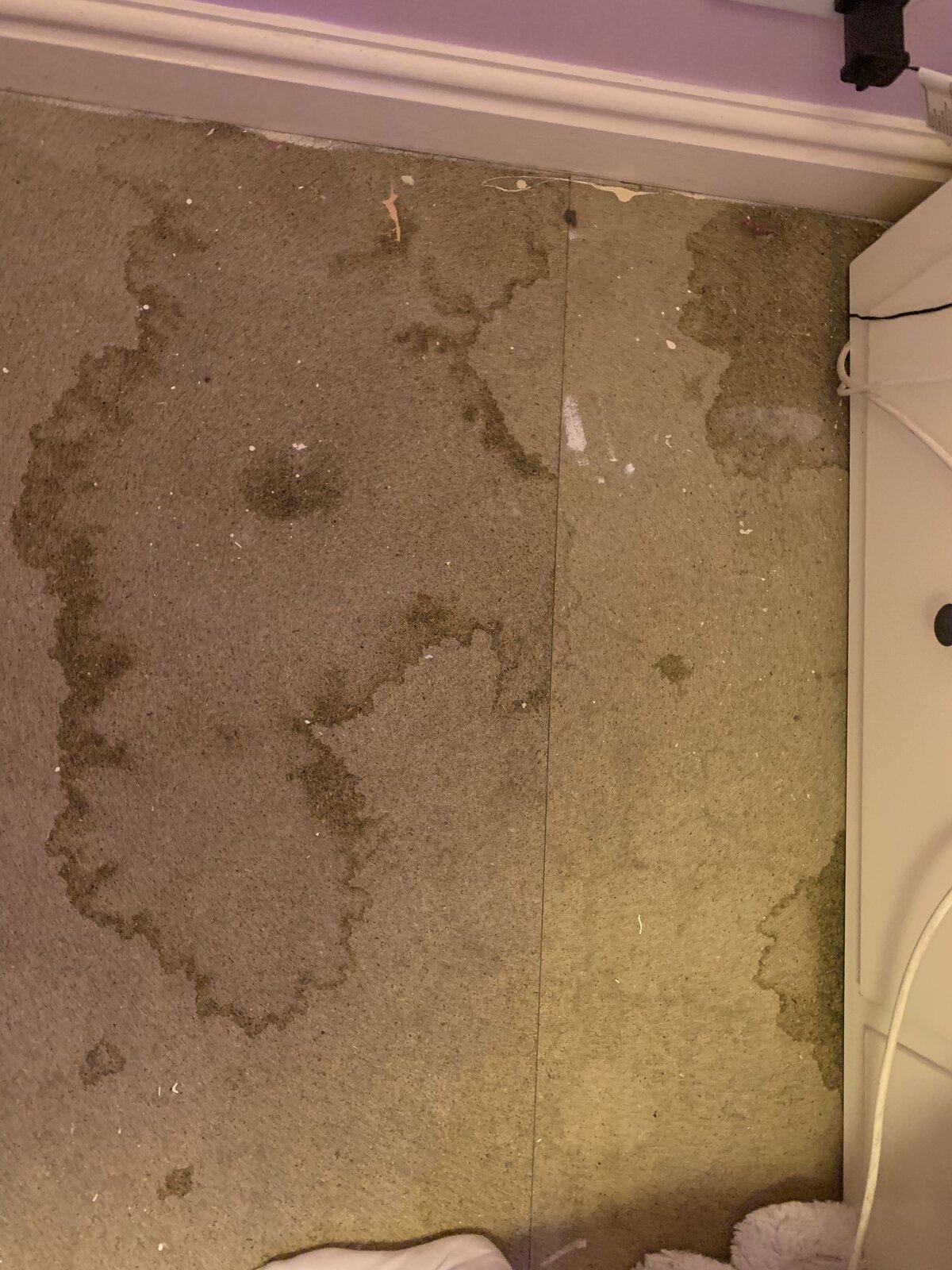 The damp does not extend to the adjoining room beyond the skirting, and the two patches to the right of the picture are beneath a bed, being about two feet apart.