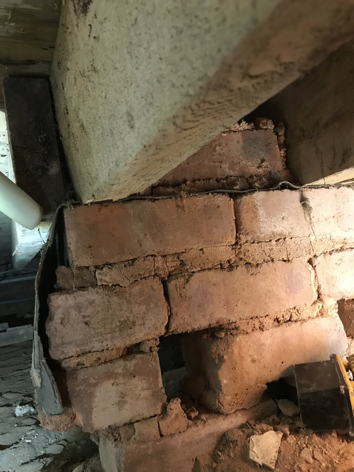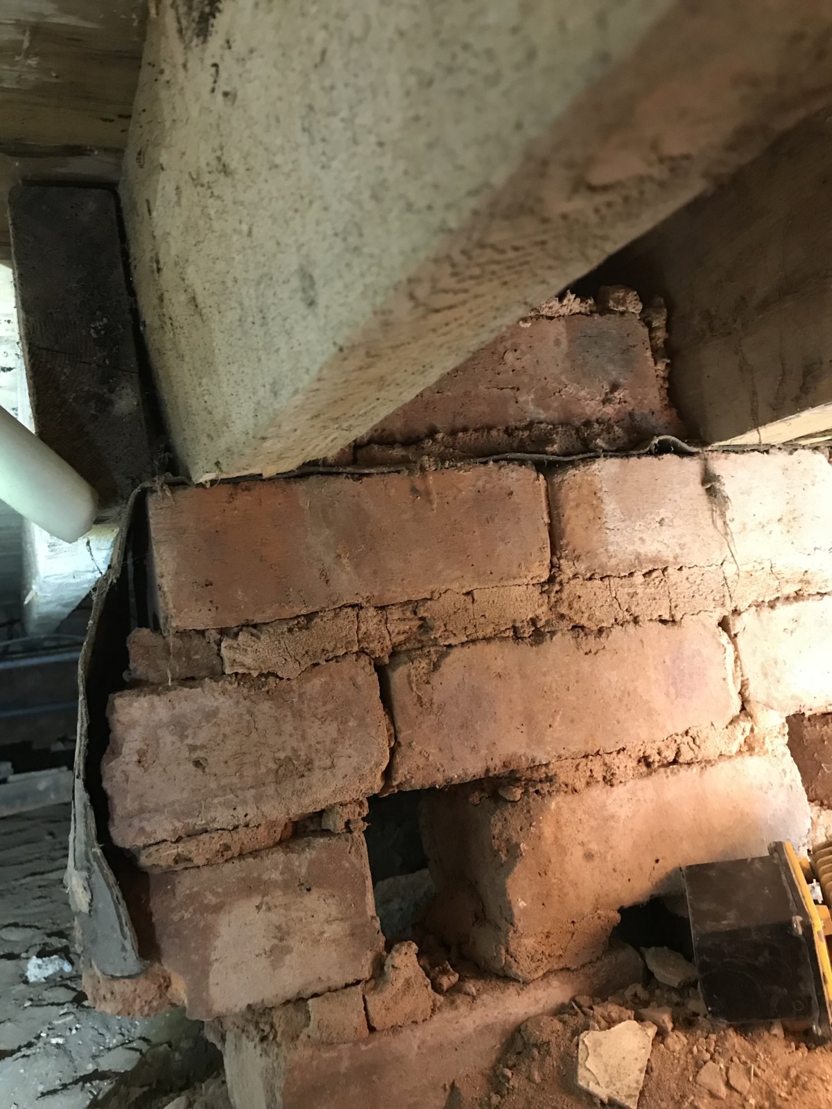 , The joists look good with no rot but to my horror someone has hacked the support walls out underneath all the door ways for access I guess, (possibly plumber or electrician maybe) and they’ve left joist just hanging with nothing underneath some of them, only sistered to other joist, I’m annoyed, so looking forward I’m thinking of jacking up the said joists knocking out all the loose cement and bricks, and rebricking it, leaving it to harden a few days then knocking wedges between bricks and joist to level off, I’ll install a dpc in the brick work, also thinking of putting a dwarf wall across the room at halfway point as it’s 4.5 meter span with no support, what do you guys think please, am I missing anything