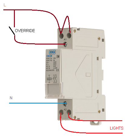 If the overide switch is put into the Neutral to the relay coil ( terminal A2 ) then the sneak circuits ( the purple ones ) that cause a latch up cannot occur