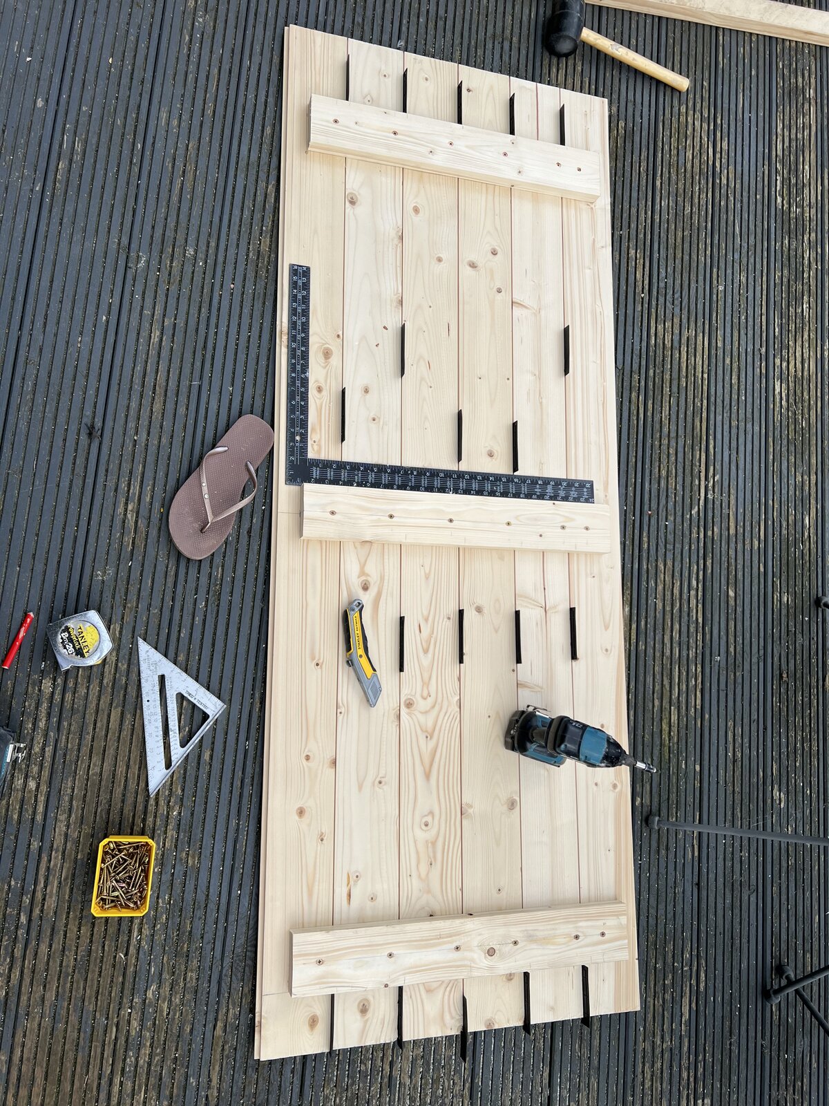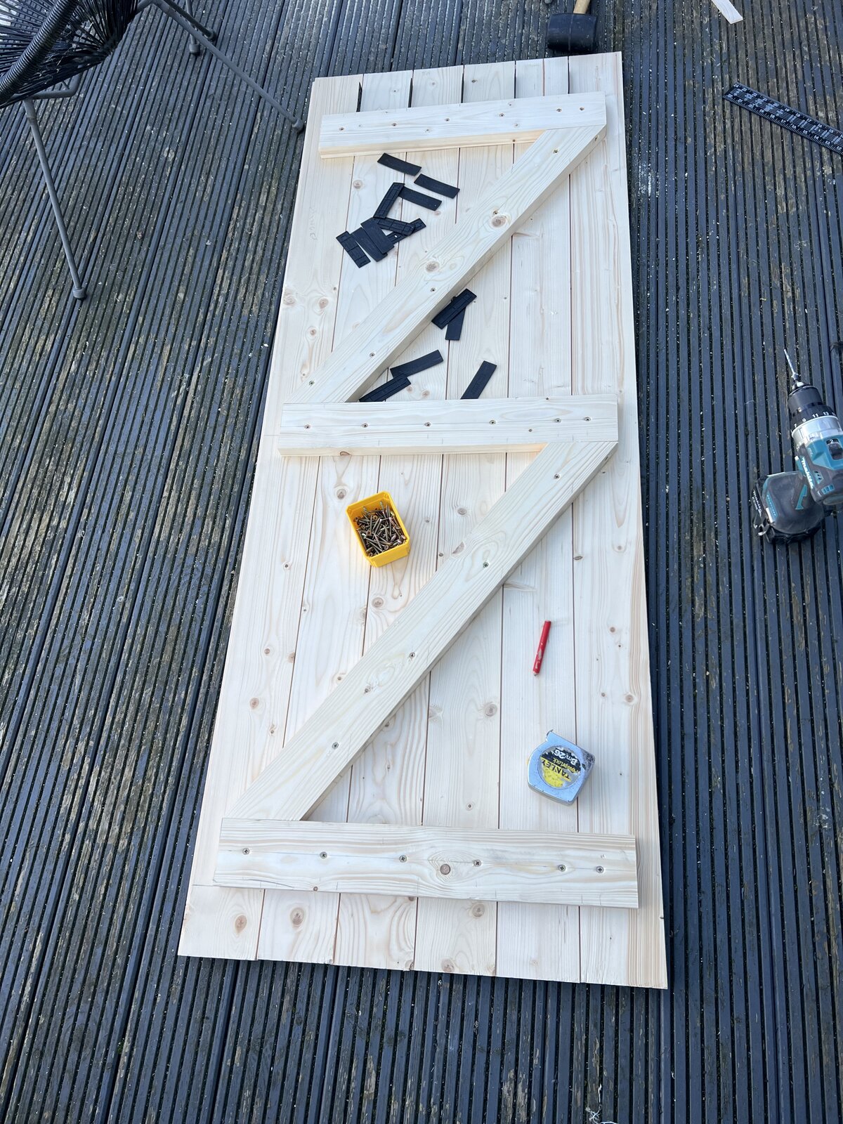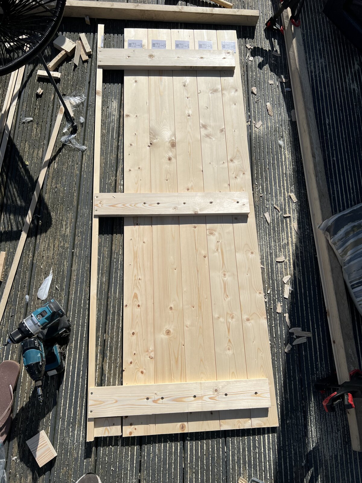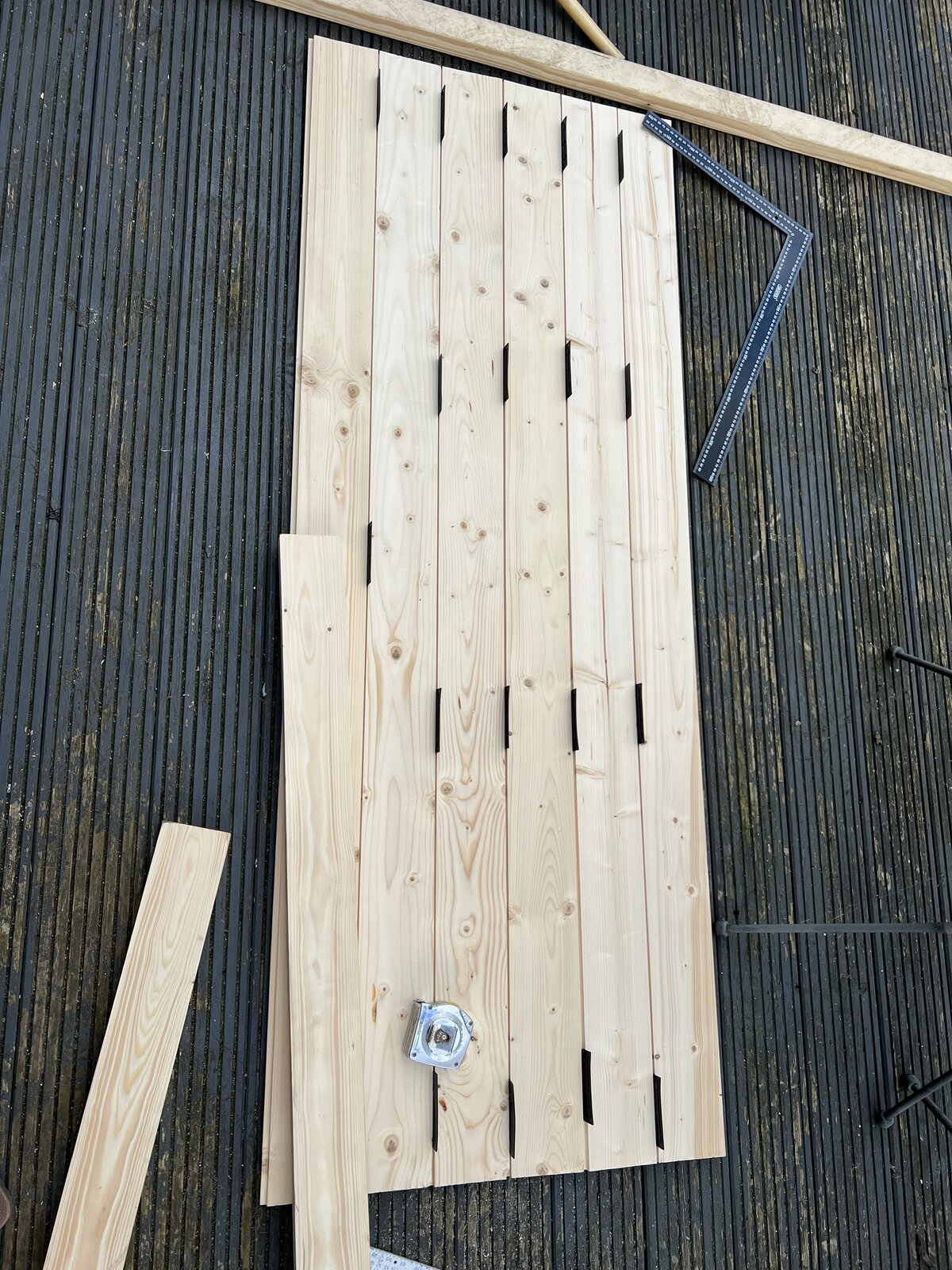 My choice is on the first door on the opening side of the door the Ledges are modified, on the face side of the ledges are reduced by the thickness of the facing board - say the last 60mm. When you get to the fixing the last 2 boards a board (with either the Tonge or Grove trimmed off) should but put into the reduced thickness of the ledge), but you may wish to fix that board just after fixing the first board. Before you fix the last narrowed board plane the saw edge smooth by around the 2mm I'd previously commented on being oversize.