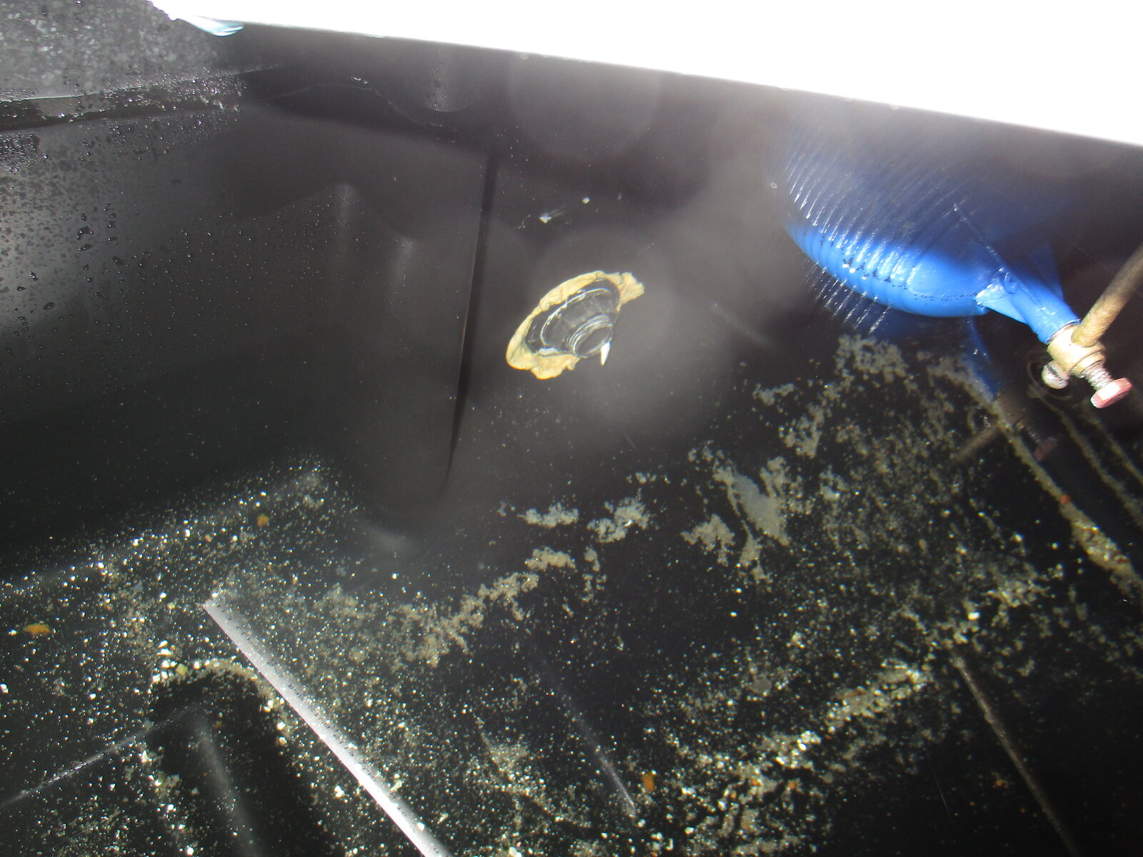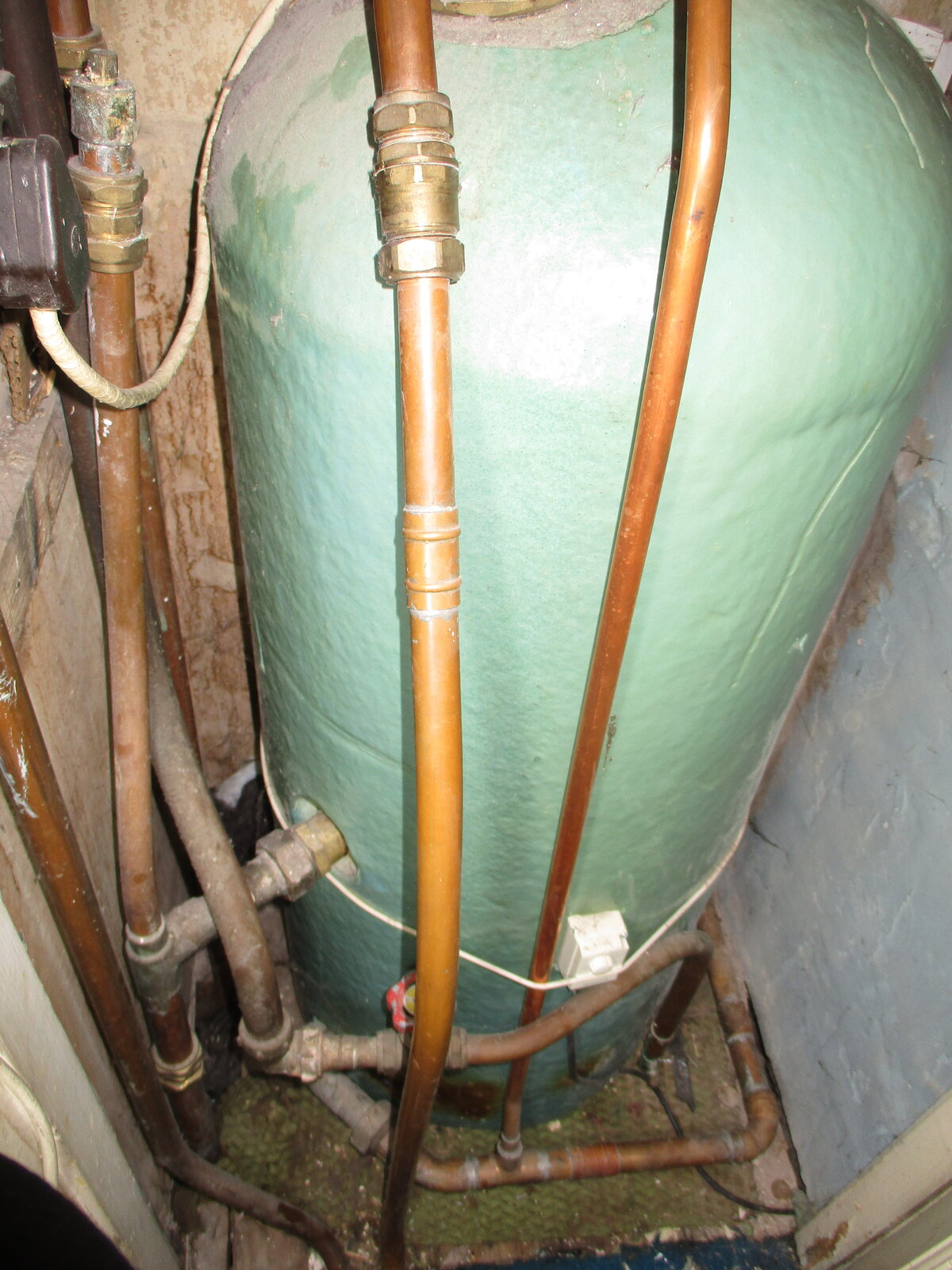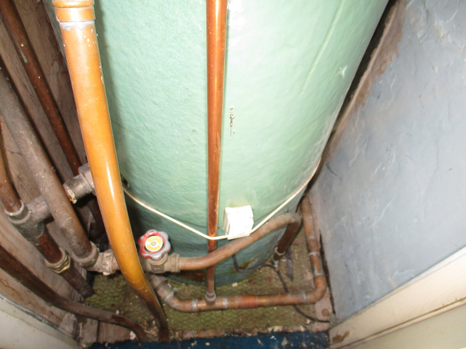 IMG_8354 is a shot of the inside front of the coffin tank, through the water. The upper part of the photo is the base of the tank. The lower part of the photo is the inside of the front wall of the tank. The outlet on the left goes to the garage, the one on the right goes to the Airing Cupboard.