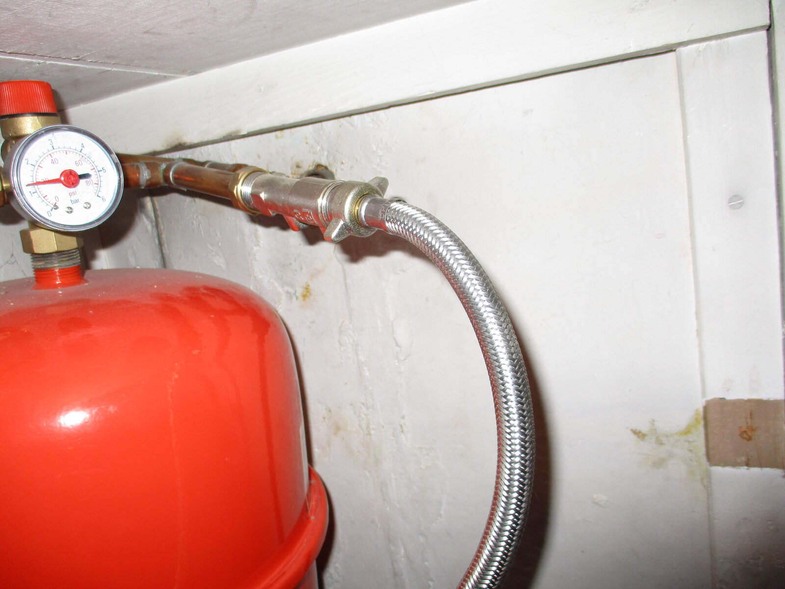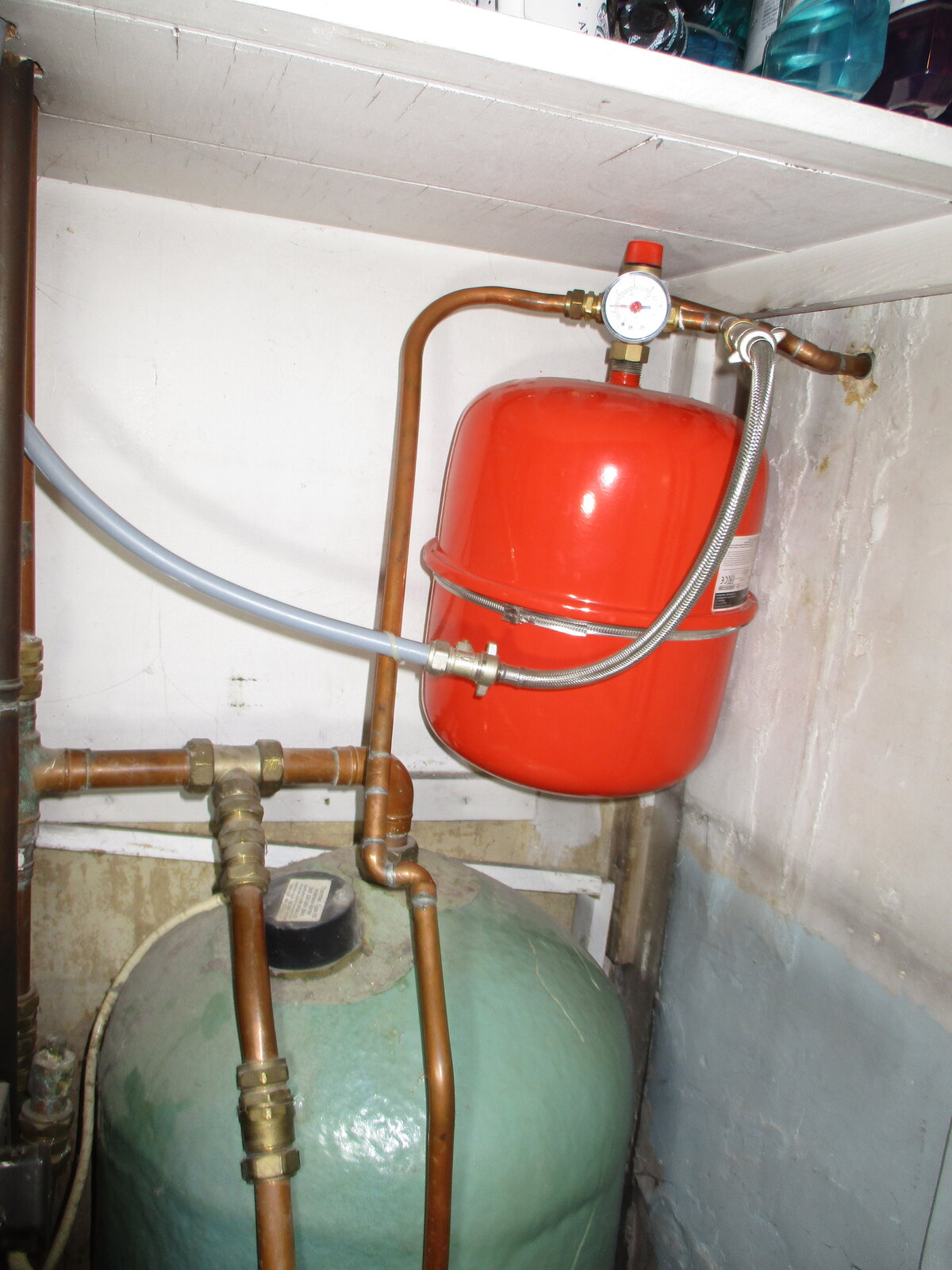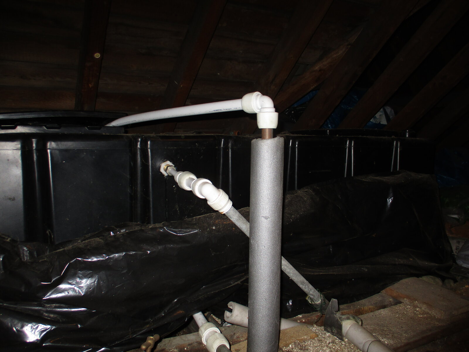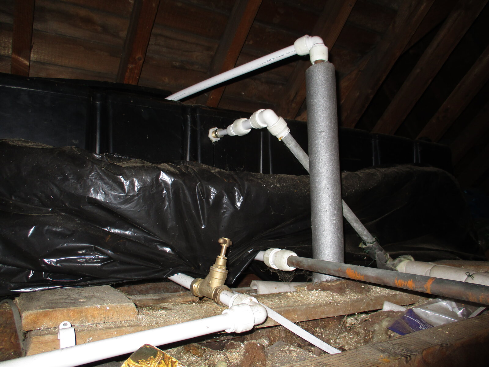 IMG_8349 is a photo of the front of the plastic loft water tank (coffin), showing three of the four connections to it. The Uppermost inverted L shaped PVC pipe lagged on its vertical section, is the cold water mains feed. This enters the tank through its left square top hatch. The ball valve is attached to the end of this pipe. The next pvc pipe down, is the tank overflow pipe. Of the two lowermost pipes, the left one goes to what was the garage and is now in the (slow) process of being converted into a workshop. The one on the right is the one which goes down into the Airing Cupboard to feed the EV.