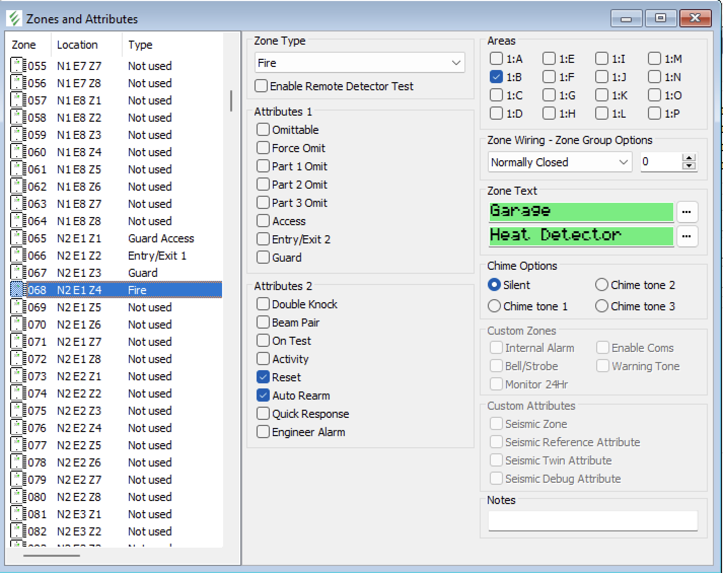 The zone is set as fire, the bell is wired to an output and set as Bell SAB, all are set to the same area.